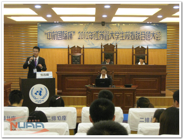 会议中,参会学生分别扮演着来自阿根廷、中国、巴基斯坦、美国等30多个国家或地区的外交官,身着正装,坐在会场中相应国家的指定席位,在主席团的主持下,通过演讲,自由磋商,有组织磋商等方式阐述“自己国家”的观点,为维护自己的“国家”利益发言,表现出了高度的专业精神和严谨作风。经过评委会和主席团的评定,南京财经大学关义春,我校江优雅获得了最佳代表称号,我校以及南京信息工程大学、淮海工学院、江苏大学共同获得了最佳组织奖。