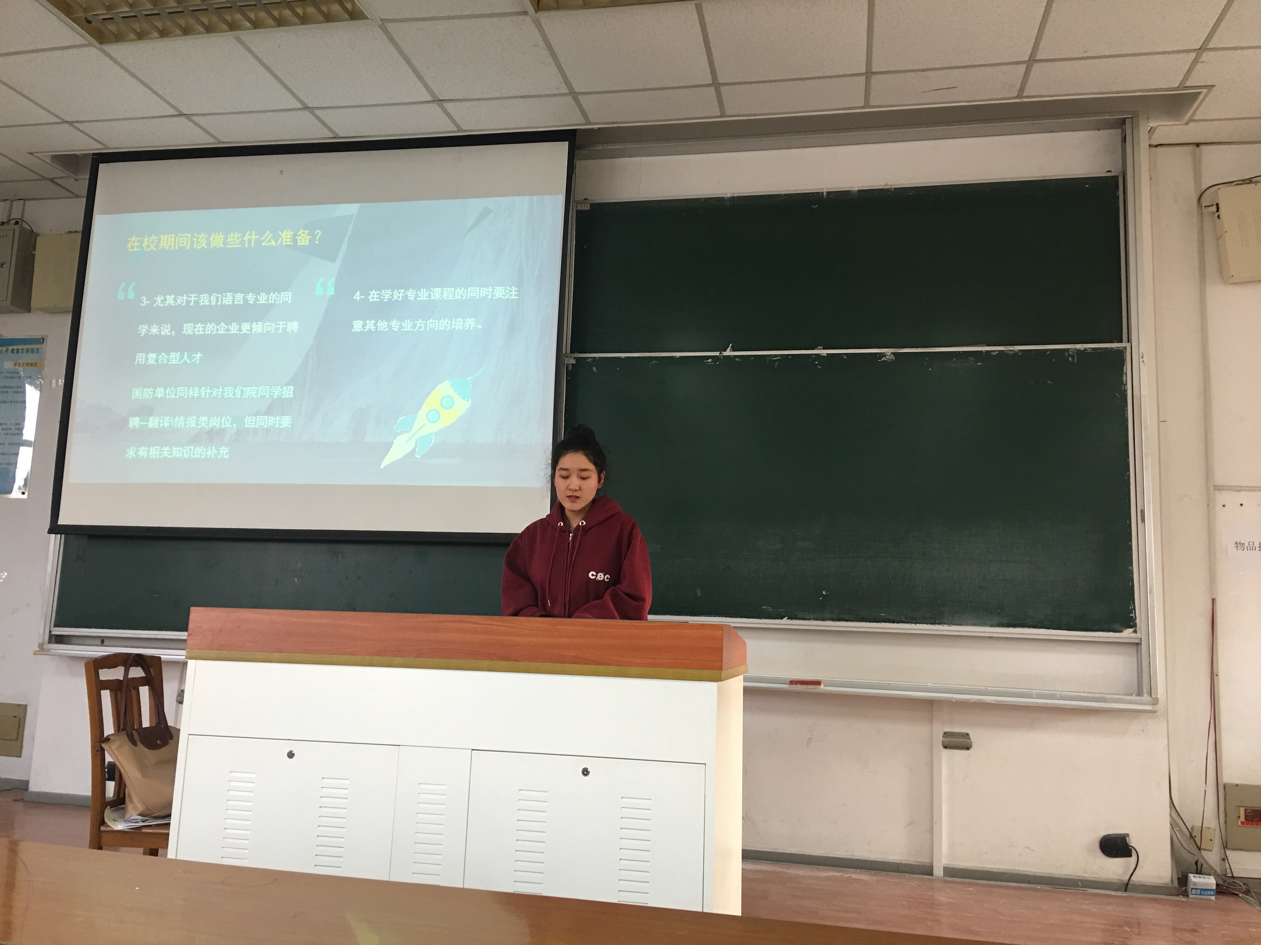 在分享中,大三英语专业学生云天华介绍了国防单位的优势:轻松愉快的工作氛围、完善的人才培养机制、福利待遇较好。同时,针对如何提高进入国企的竞争力提出了以下建议:最重要的就是学习专业知识,夯实基础;其次,不断提高协调沟通能力,利用实践机会走出校园,积累实习经验;此外,国企更倾向于复合型人才,要求大家有意识的提前准备做好知识积累。