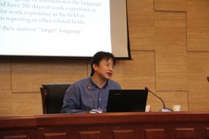 报告认为大数据时代,海量学习资源、图文声像的媒体合成,必将催生泛在自主学习,许教授以分析UN、EU等机构职业译员招聘的资格与能力要求、阐释AIIC关于职业译员个人素养的规范为基础,结合中国口译教学实践,与听众共同探讨口译自主学习模型构建,提出可行性学习原则,提倡优化学习策略,整合优质学习资源,通过口译自主学习,检验听、说、读、写发展,并在口译学习中全面提升英语综合能力。