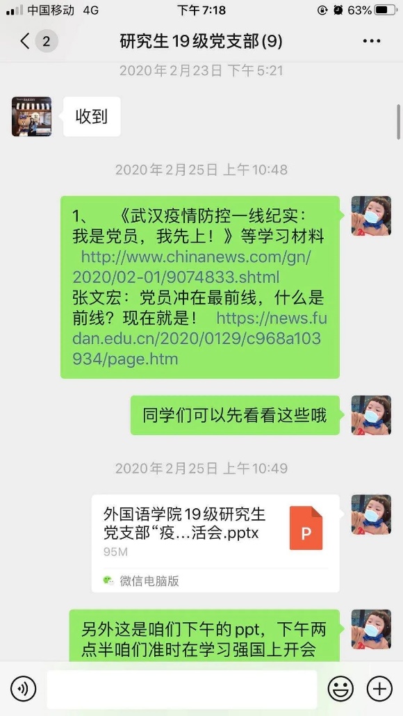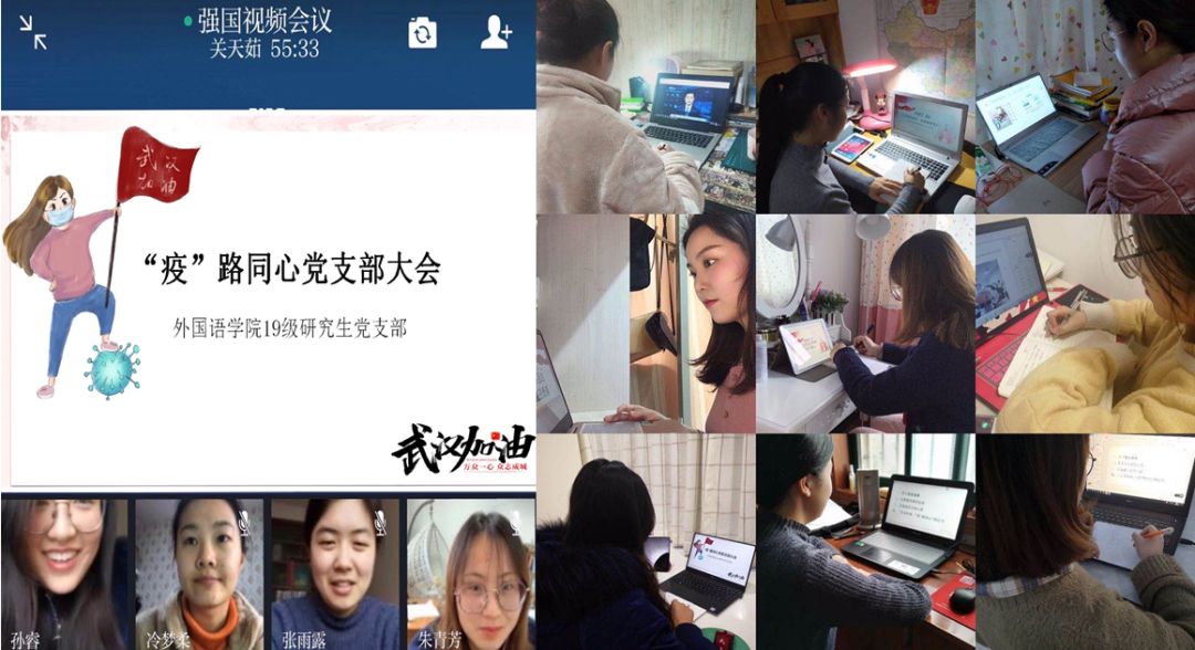 伟德bv国际体育研究生各党支部,充分运用网络新媒体阵地,创新组织生活“线上”模式,在特殊时期在线上开展各研究生党支部党员大会,通过“云端”开展理论学习、党员与群众联系工作,在论文进度、求职签约、毕业答辩、日常打卡等方面开展定点沟通帮扶,充分发挥党支部战斗堡垒作用和党员先锋模范作用。下面就让我们一起去了解他们在疫情期间的行动吧。