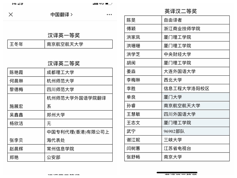 伟德bv国际体育高度重视此项赛事,鼓励支持学生积极参与其中。2015-2019年间,学生共获得英译汉二等奖2项,三等奖2项,优秀奖15项,汉译英优秀奖3项。本次汉译英一等奖更是实现了历史性突破。获奖的两位同学表示,成绩的取得离不开学院提供的丰富的实习实践机会,以及专业教师在课堂内外的悉心教导。