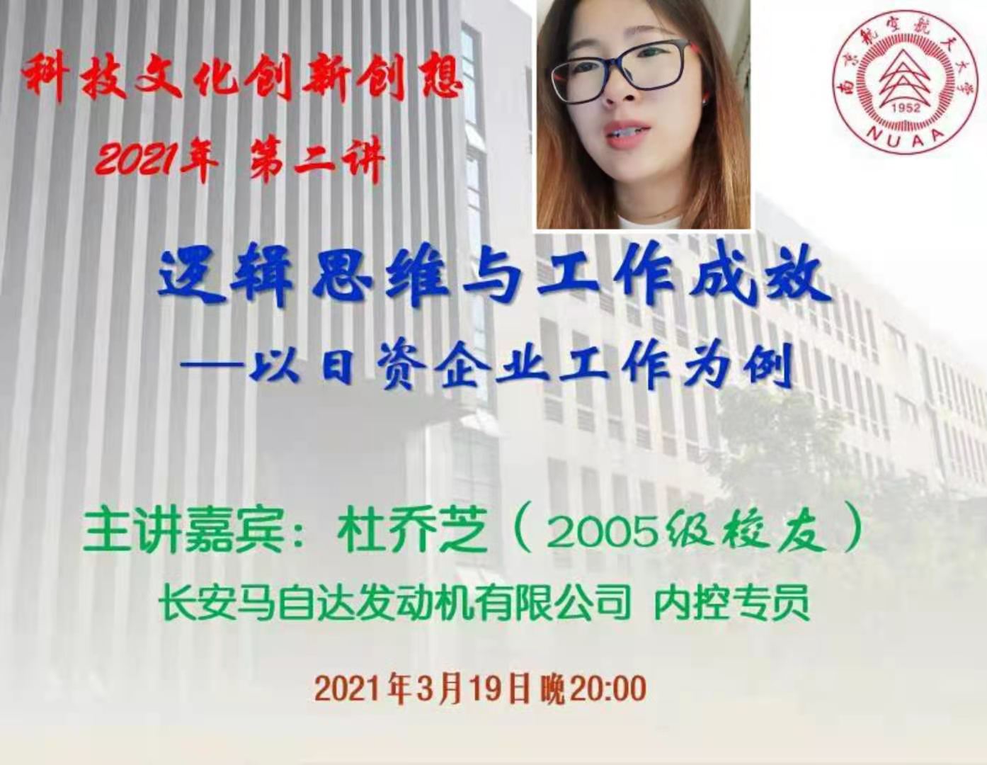 3月19日,伟德bv国际体育日语系科技文化创新创想课程第二讲通过腾讯会议模式开启,主题为《逻辑思维与工作成效—以日资企业工作为例》,主讲人为南航2005级校友杜芝乔,曾任南京长安马自达发动机有限公司总裁助理,现任该公司内控专员。