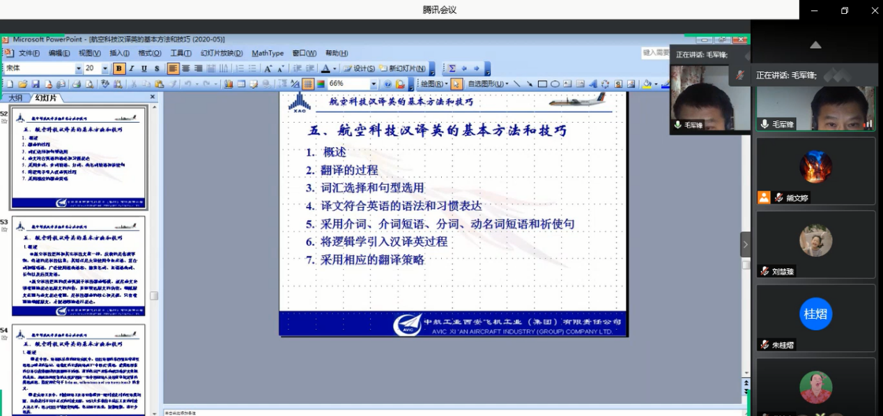 作为南航特色之一的航空英语是我校外语专业学生亟需学习的课程,而航空英语翻译对MTI的学生尤为重要。在长达两个半小时的课中,毛老师为同学们介绍了航空发展简史、科技英语的基本语言特点、科技英语翻译的基本方法、航空科技英语的特点以及航空科技汉译英的基本方法和技巧。多年积累的实践经验加上深入浅出的授课方式让同学们受益匪浅,对航空英语翻译的学习有了新收获。课堂上,毛老师的授课为大家打开了新的视野,线上讨论氛围浓厚,课程即将结束之时,同学们也都纷纷对老师表示感谢。