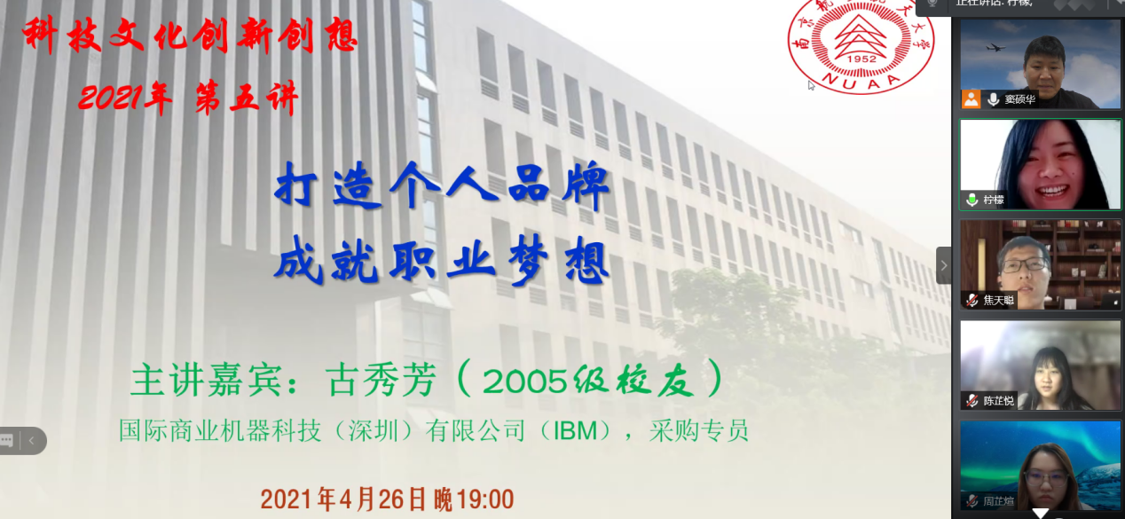 4月26日晚上7:00,伟德bv国际体育日语系科技文化创新创想课程第五讲通过腾讯会议模式开启,主题为《打造个人品牌,成就职业梦想》,主讲人为05级日语系校友古秀芳,现任国际商业机器科技(深圳)有限公司(IBM)采购专员。