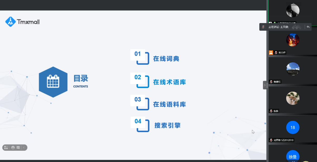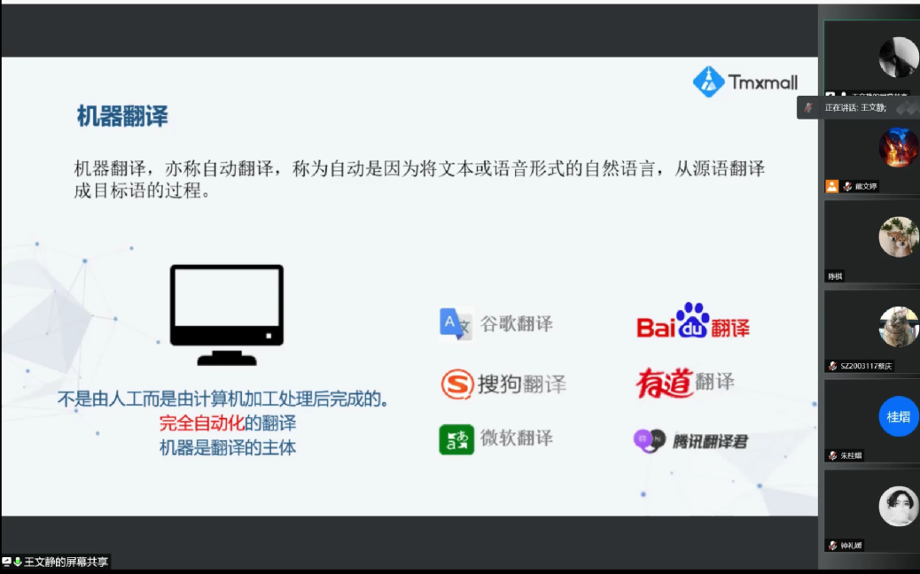 7月8日晚7点,上海一者信息科技有限公司高级运营经理王文静应伟德bv国际体育邀请,为20级MTI研究生带来了一堂精彩的线上讲座。王经理曾参与多个大型特色语料库建设项目,擅长语料库的生产制作及检索分析,并熟悉各类主流计算机辅助翻译工具实践应用,本次她带来的讲座主题为“信息检索与机器翻译译后编辑”。