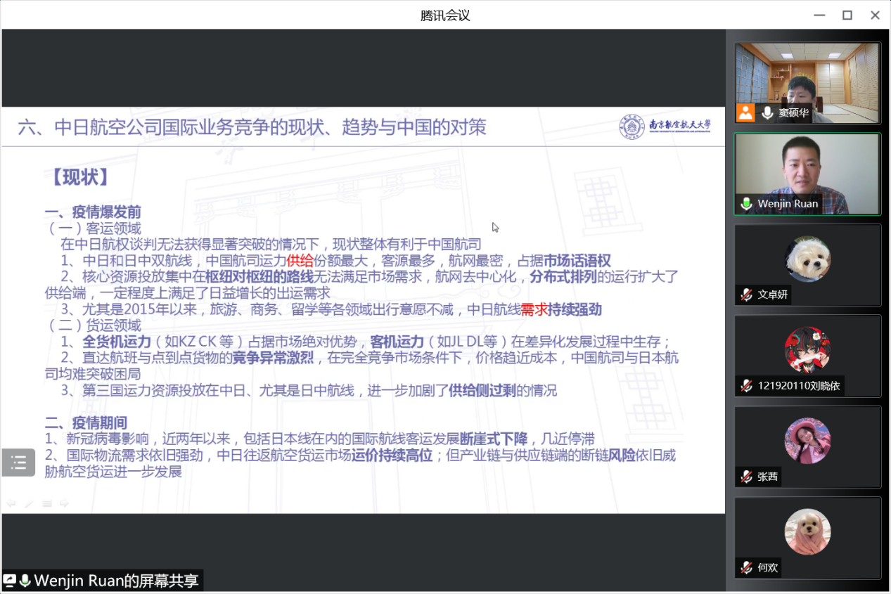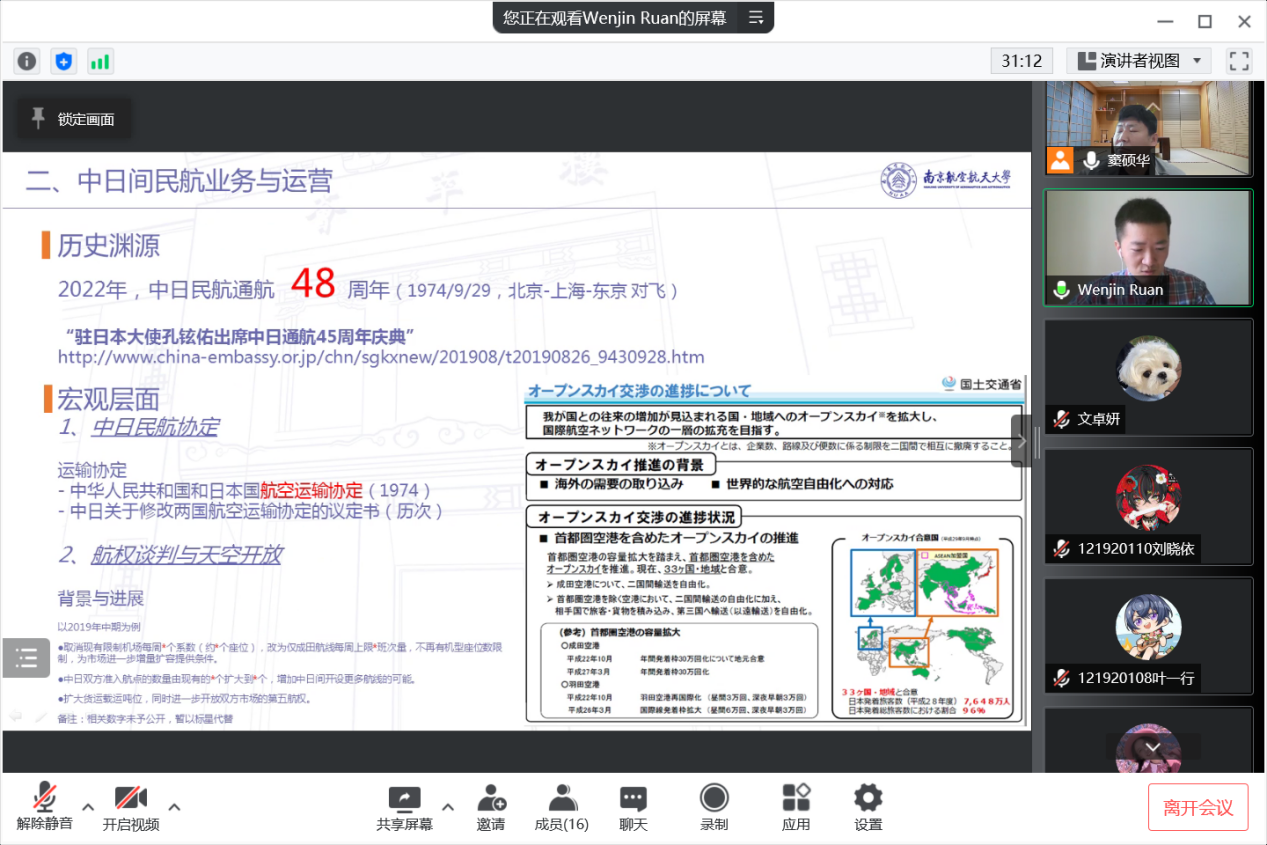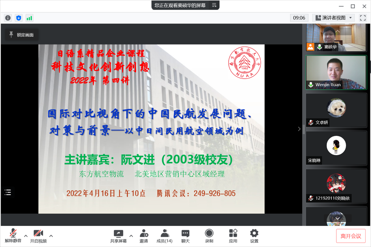 4月16日上午10点,伟德bv国际体育日语系精品企业课程《科技文化创新创想》2022年度第四讲通过腾讯会议成功进行,本次主题为《国际对比视角下的中国民航发展问题、对策与前景——以中日间民用航空领域为例》。主讲嘉宾为03级日语系校友、现就职于东方航空物流北美地区营销中心的阮文进经理。
