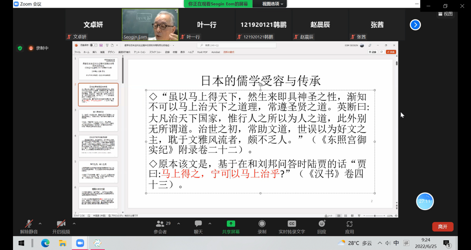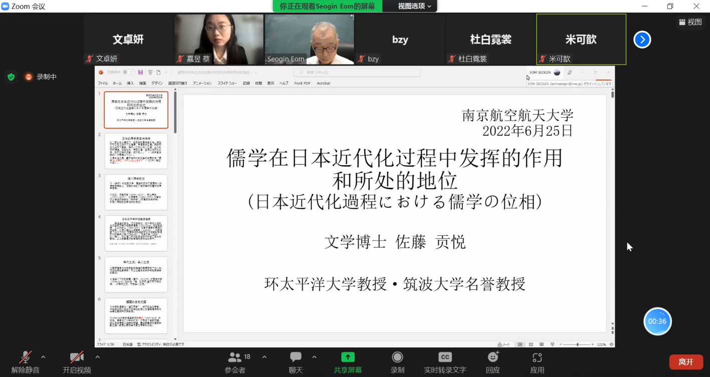 6月28日(周六)上午9:00,伟德bv国际体育日语系海外名师讲坛第二讲通过线上ZOOM会议成功进行,主题为《儒学在日本近代化过程中的作用》。主讲嘉宾为环太平洋大学教授・筑波大学名誉教授佐藤贡悦。