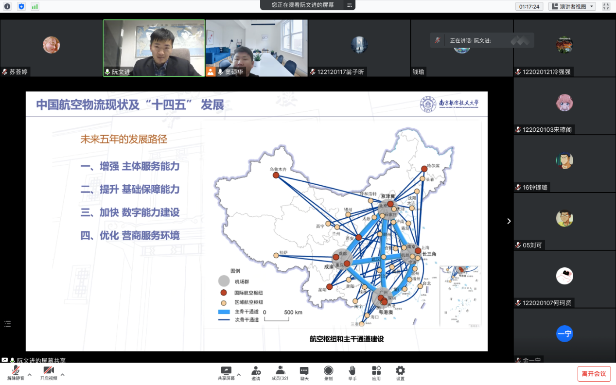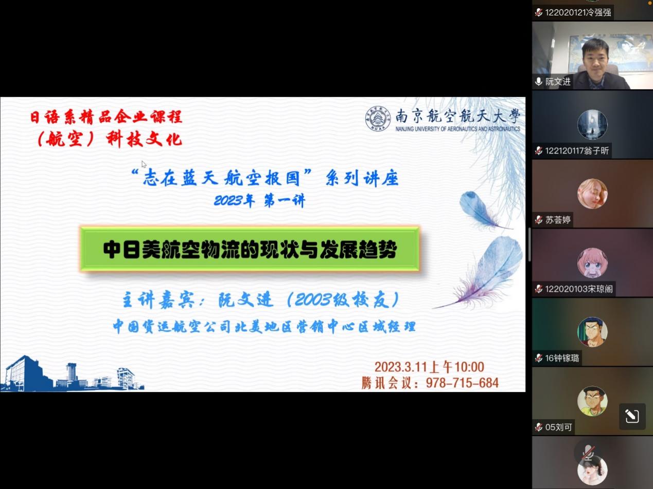 3月11日上午10:00,伟德bv国际体育日语系中日航空科技文化课程“志在蓝天,航空报国”2023年度第一讲通过腾讯会议成功举办,主题为《中日美航空物流的现状与发展趋势》,主讲嘉宾为03级日语系校友阮文进,曾任东方航空公司日本区域经理,现任中国货运航空公司北美地区营销中心区域经理。