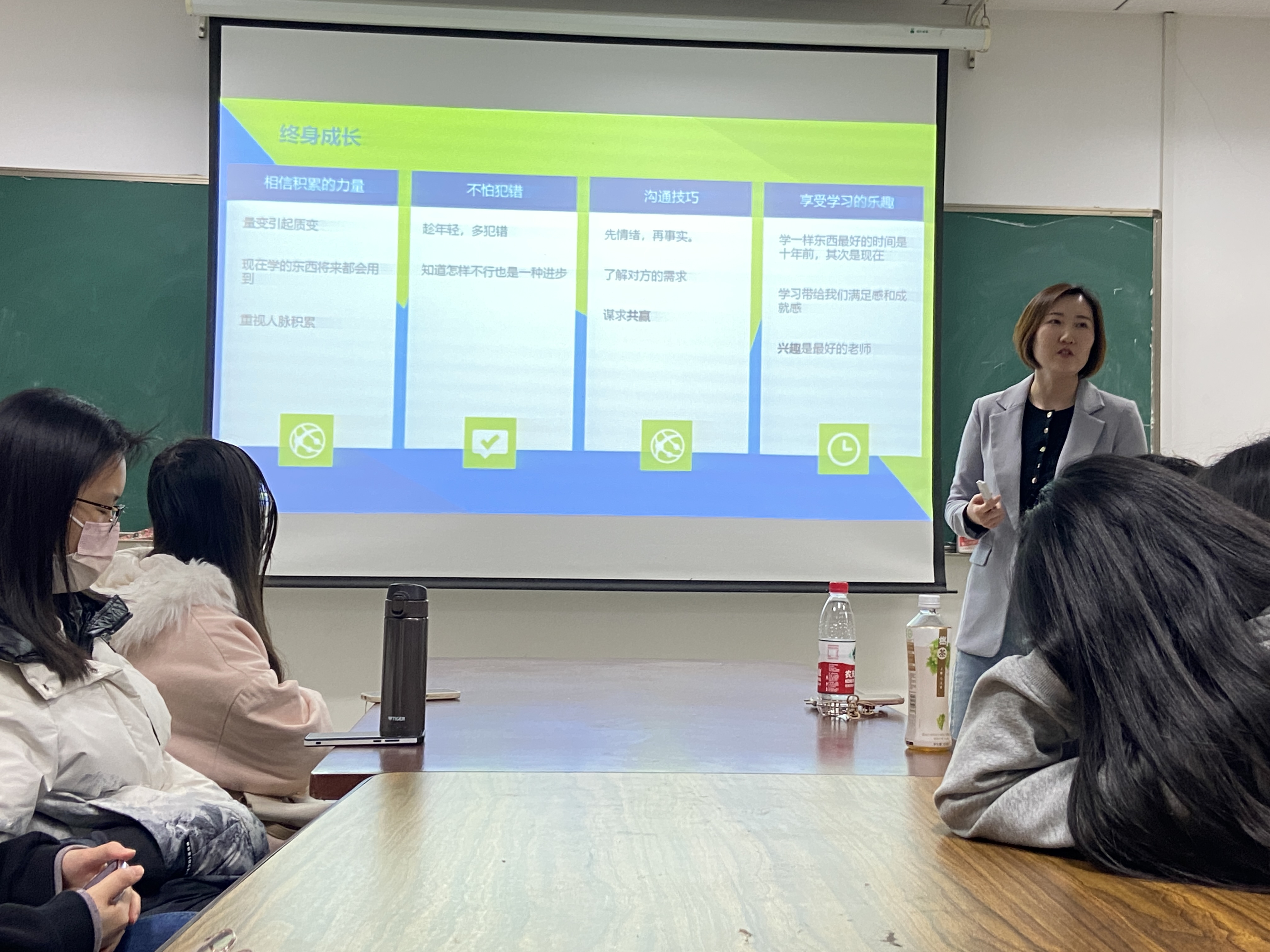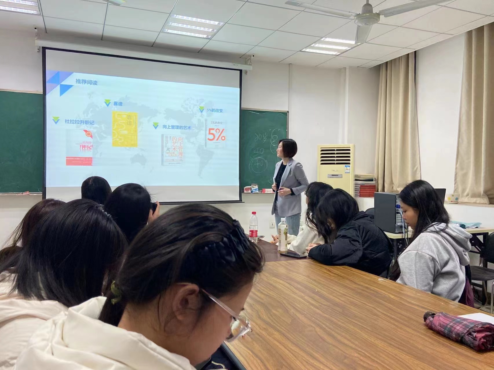 除此之外,郭璇经理还向同学们简明扼要地讲解了日企工作方式,并分享了自己的心得体会。她强调“融入团体能力”、“观察企业文化”等对于个人的职业生涯规划发展起着重要作用。同时,给出了“坚持终身发展”的建议,激励同学们敢于试错、积极沟通、相信积累、享受学习。最后,她为同学们推荐了四本职场相关的书籍,希望能为大家融入职场提供帮助。