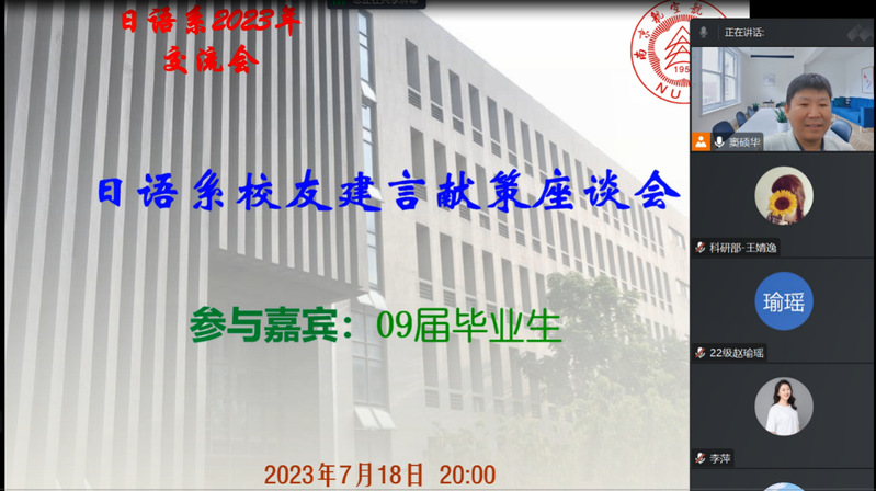 为凝聚校友力量,加强校友联络,促进专业发展,2023年7月18日伟德bv国际体育日语系召开校友建言献策座谈会。此次座谈会由伟德bv国际体育日语系主任窦硕华主持,伟德bv国际体育团委书记李萍、日语系教师王鹏飞、本科生辅导员赵瑜瑶以及4位2009届毕业生参加。