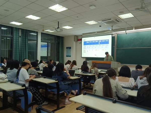 活动伊始,大三年级中心组成员马晨馨介绍了两位同学被录取的院校情况。之后,考取华东师范大学英语笔译专业的王晨露分享了MTI备考经验。她详细介绍了考试科目、备考规划、各科重点及择校技巧等信息,并结合个人心得提供了具体建议,帮助同学们明晰了学习目标和学习方向。