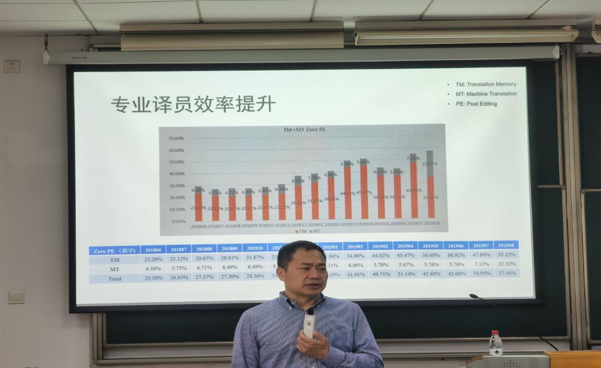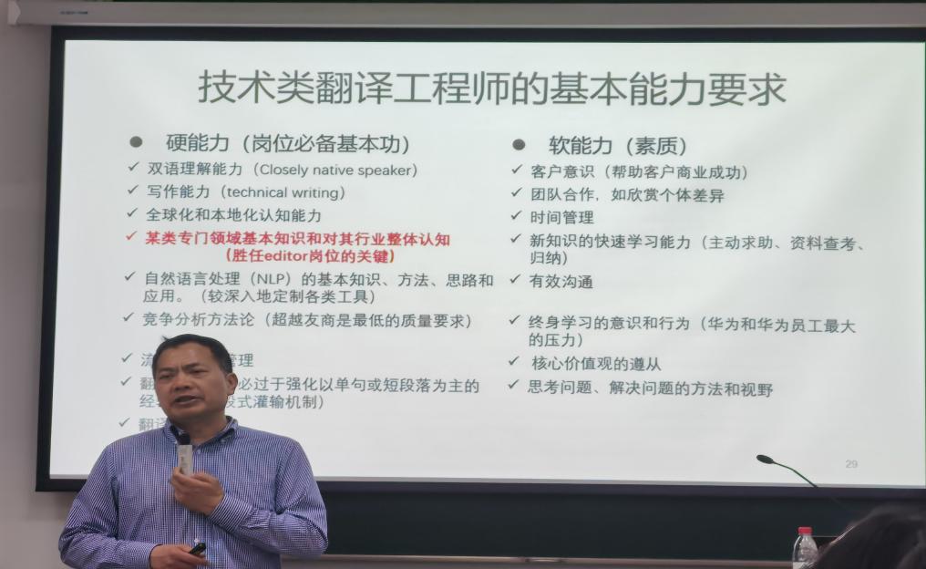 在介绍机器翻译的编码器——翻译模型时,陈圣权详细阐述了其发展历程。从早期的简单模型到如今复杂而高效的模型,他通过一系列案例展示了人工智能在翻译领域的不断进步。这些案例生动地体现了技术的迭代升级,也让大家对机器翻译的演进历程有了清晰的认识。为了让师生们更加深入领悟技术翻译的内涵,陈圣权以华为的实践为例,展示了技术翻译在企业国际化进程中的重要作用,他强调,技术翻译已经全面转向MTPE(机器翻译+译后编辑)模式,这一模式不仅重塑了翻译流程,还对翻译知识体系提出了新的要求,那么翻译工程师在创译过程中扮演着重要角色,通过创译可以有效提升用户体验,满足不同用户的需求。