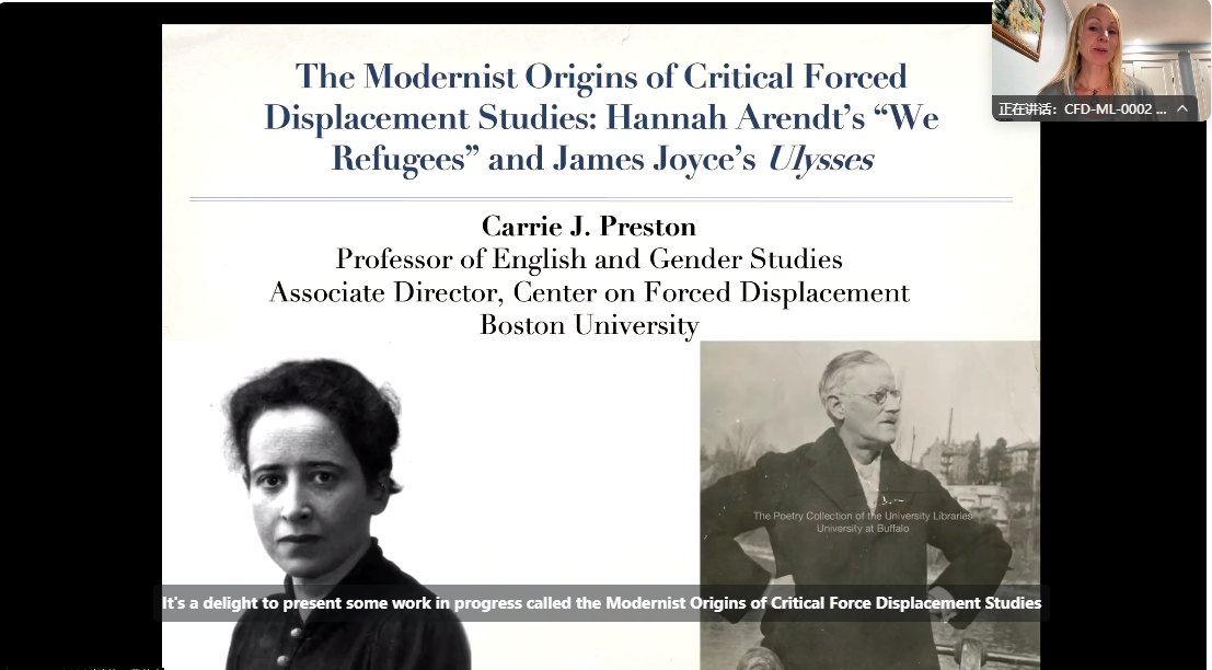 普雷斯顿教授首先以“The Modernist Origins of Critical Forced Displacement Studies: Hannah Arendt’s ‘We Refugees’ and James Joyce’s Ulysses”为题,将汉娜·阿伦特与詹姆斯·乔伊斯的经典文本置于新兴的跨学科领域——流离失所批评研究(Critical Displacement Studies)的框架下,揭示其对当代难民制度的预言性批判,这些制度本质上将人类流动性转化为危机。
