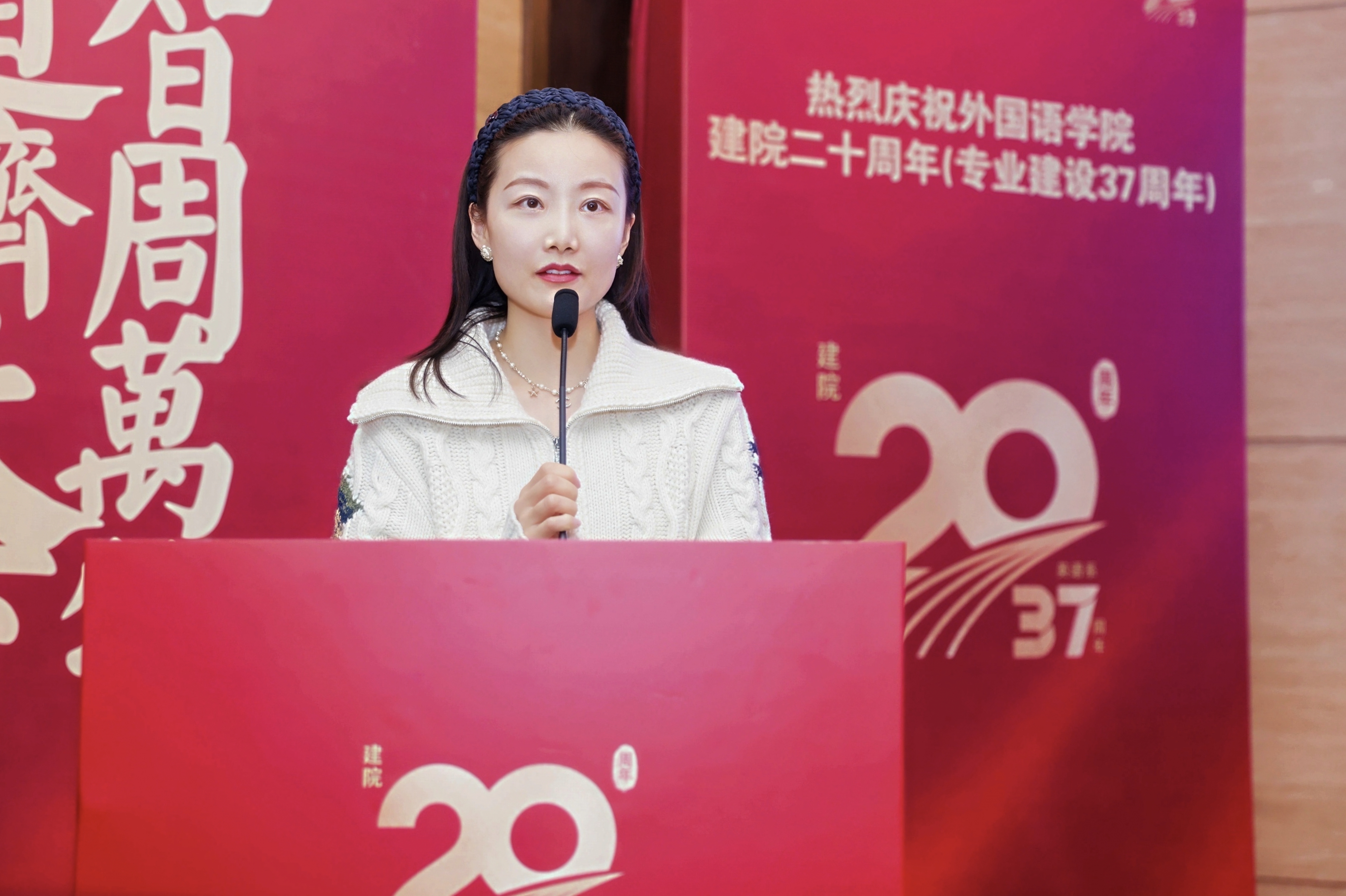 2006届本科毕业生2009届硕士毕业生,北京航空航天大学出版社副总经理、副总编辑葛建平在发言中深情回顾了她在南航两校区七年的求学时光,她表示,将军路的现代与活力,教会我们用开放的姿态拥抱全球视野;明故宫的厚重与沉静,提醒我们用严谨的态度钻研语言本质。谈及如今从事高等教育和学术出版工作的感悟,强调外语已成为连接中外的纽带、文化传承的载体以及讲好中国故事、提升国际话语权的重要力量,并祝福学院继续以语言为桥、以文化为帆,在未来培养更多国家需要的复合型外语人才,孕育更多学术硕果。