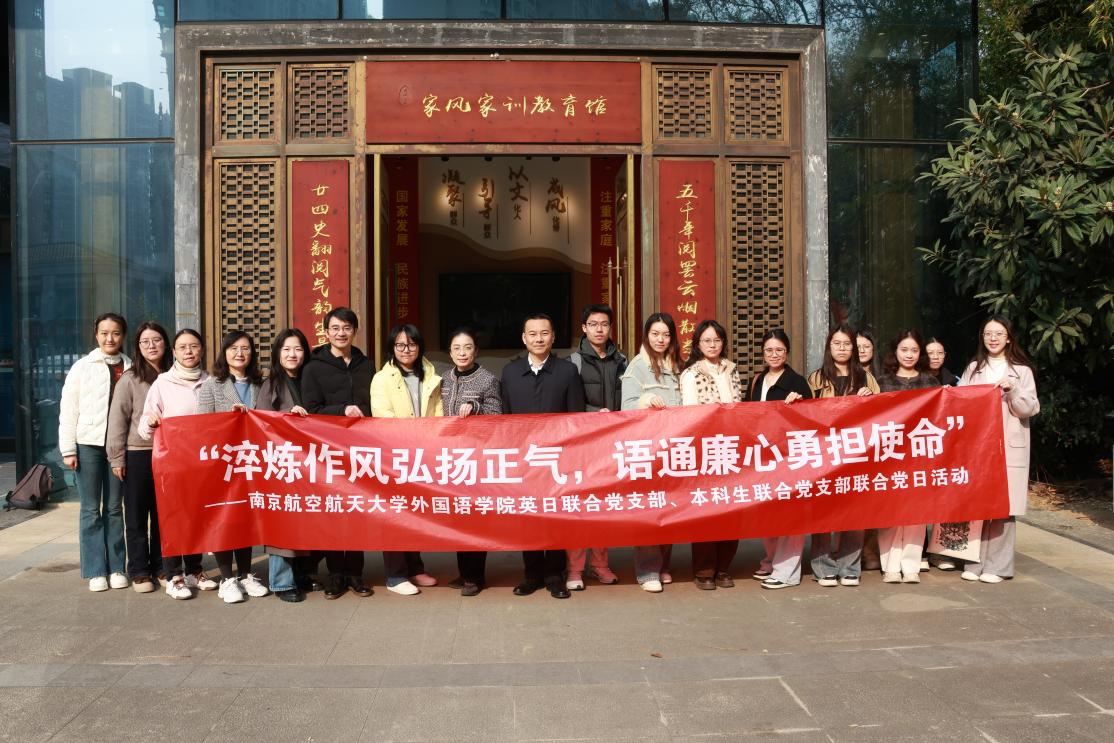 为深入学习贯彻党的二十大及二十届历次全会精神,全面落实学校第六届“清廉南航”宣传教育周工作部署,巩固拓展主题教育成果,持续深化学院党风建设,2025年12月11日,伟德bv国际体育英日联合党支部、本科生联合党支部于雨花区古雄街道廉政教育基地联合举办“淬炼作风弘扬正气,语通廉心勇担使命”主题党日活动。学院党委书记庄群华、党委副书记吴科颖、组织员杨定娟、本科生辅导员冯子格共同参与活动。