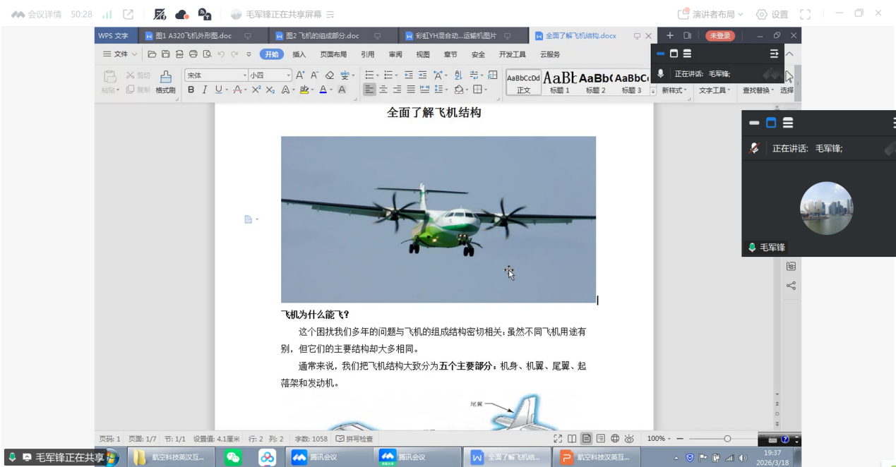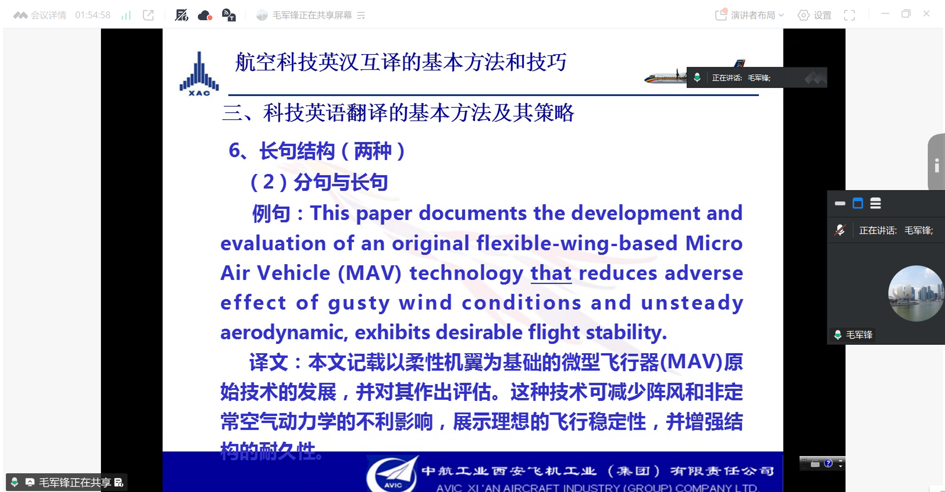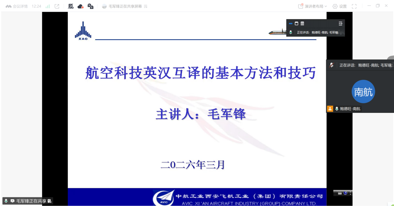 2026年3月18日晚,伟德bv国际体育MTI教育中心举办了题为“航空科技英汉互译的基本方法和技巧”的行业实训讲座。本次讲座特邀中航西安飞机工业集团股份有限公司毛军锋译审担任主讲专家。毛老师将深厚行业积淀与丰富实战案例有机融合,带领同学们深入探讨航空科技翻译,生动呈现了中外航空发展的壮阔画卷与中国航空人的奋斗足迹。