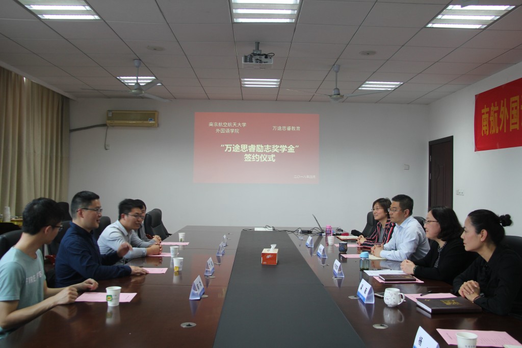 4月3日下午,伟德bv国际体育“万途思睿励志奖学金”签约仪式在学院322会议室举行。南航校友、伟德bv国际体育06届毕业生万途思睿教育校长丁亮、万途思睿教育分校负责人杜敏、陈功、徐正,伟德bv国际体育党委书记刘健荣、副院长刘长江、党委副书记梁薇、校学生处资助管理中心主任雷蕾、伟德bv国际体育团委书记杨一、本科生辅导员彭欢、本科生兼职辅导员张秋逸参加了此次签约仪式。