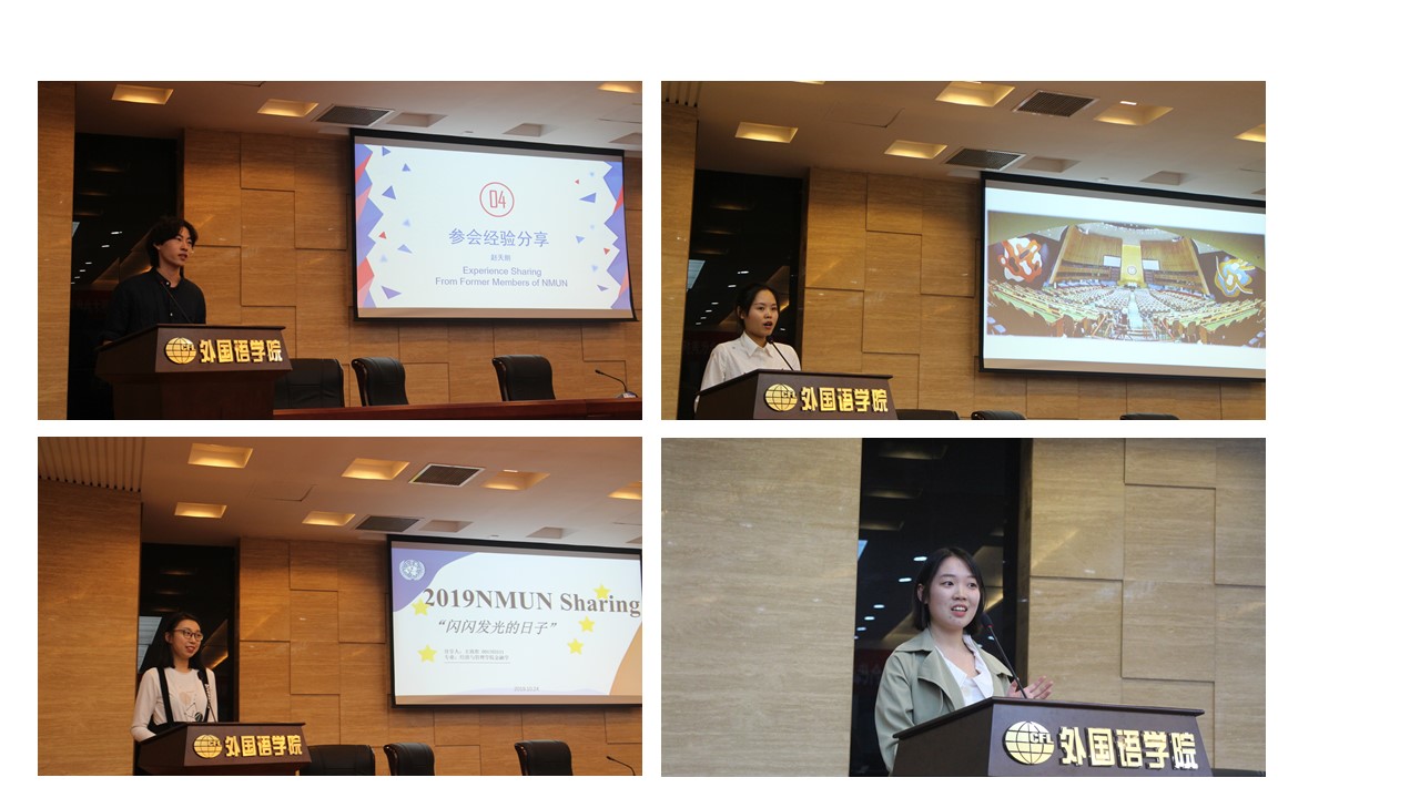 接着,往届参赛代表赵天朗介绍了他与模联的缘分以及如何从一名大一新生走进模联的历程;朱一娴介绍了自己从准备到参赛一路走来的心路历程,并现场讲解了立场文件的写作技巧;王欣彤分享了选拔过程经历、培训内容和对个人的能力素质要求;王姝具体介绍了纽约模联和联合国会议的异同;董云炜分享了纽约模联的现场和比赛过程。