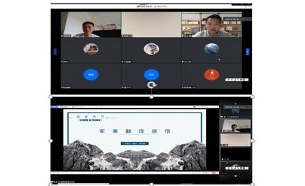 随后,南航郭小星同学和国关朱江甫同学分别就“居家学习(Study at Home)”的经历和感悟做了精彩的分享。郭同学给我们分享了时间管理和自律意识提高的方法,朱同学则以军事翻译实例为我们分享了军事翻译的特色和注意事项。