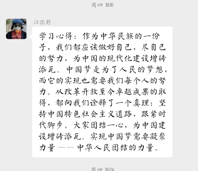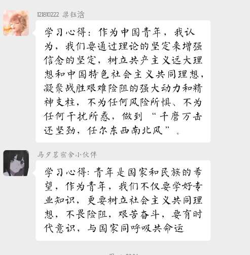 在线下讨论时,同学们积极发言,气氛活跃,充分展现了当代青年的精神面貌,增强了支部活力和凝聚力,提高了同学们对团工作的积极性和参与度。线上交流中,有的支部在会议中选择用声音传达自己的心声,有的则选择了以文字的方式记录下来,团员青年以小组或寝室为单位多样方式分享学习感受。在本次活动中,同学们反响热烈,积极在群内分享学习感悟,通过自我学习和与他人分享,更加深刻理解团员青年的责任与担当。
