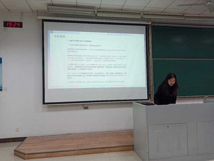 接着,杨雨柔同学就考研方向的行业调研进行了分享,以伟德bv国际体育大学英语专业为例,具体讲解了行业调研时要注意考研形势、参考书目的选读、考研准备时间、复习备考策略等事项。