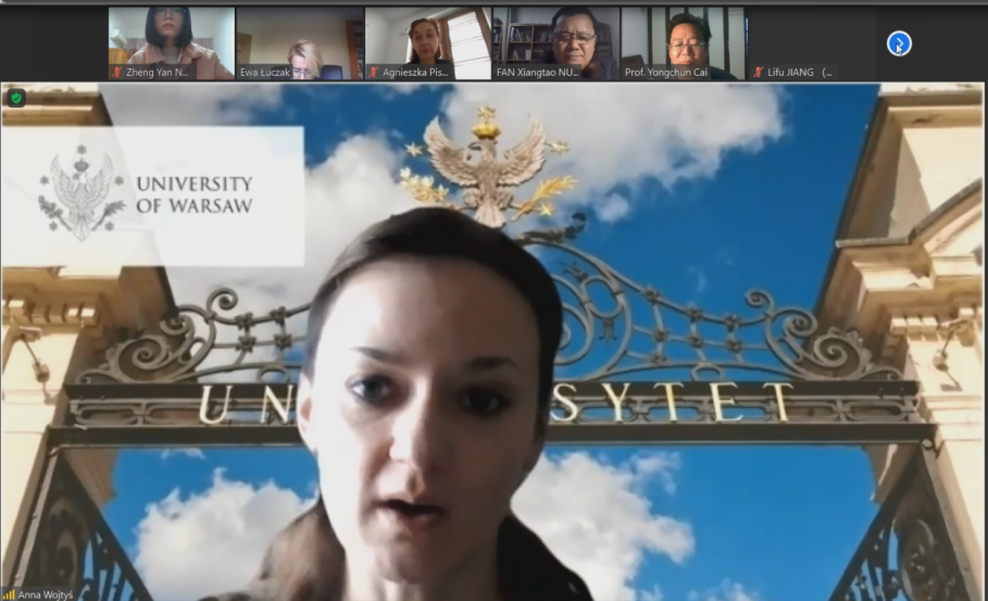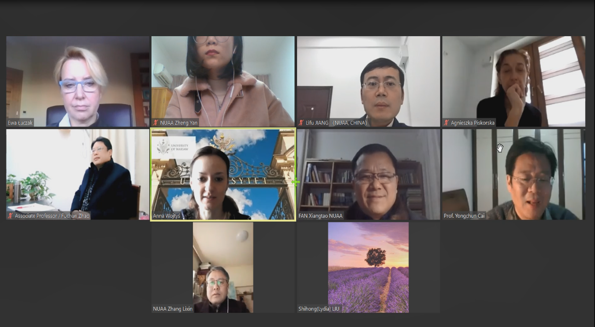 1月28日下午,伟德官网与波兰华沙大学(University of Warsaw)现代语言学院顺利召开国际合作线上会议。波兰华沙大学现代语言学院副院长Anna Wojtys、英语研究系主任Agnieszka Piskorska、Ewa Barbara Luczak,伟德官网院长范祥涛、副院长徐以中、副院长姜礼福、英语系主任张立新、学院对外联络中心主任赵富春、英语系教授蔡咏春等8位教师出席了会议。会议由伟德官网刘世红副教授主持。