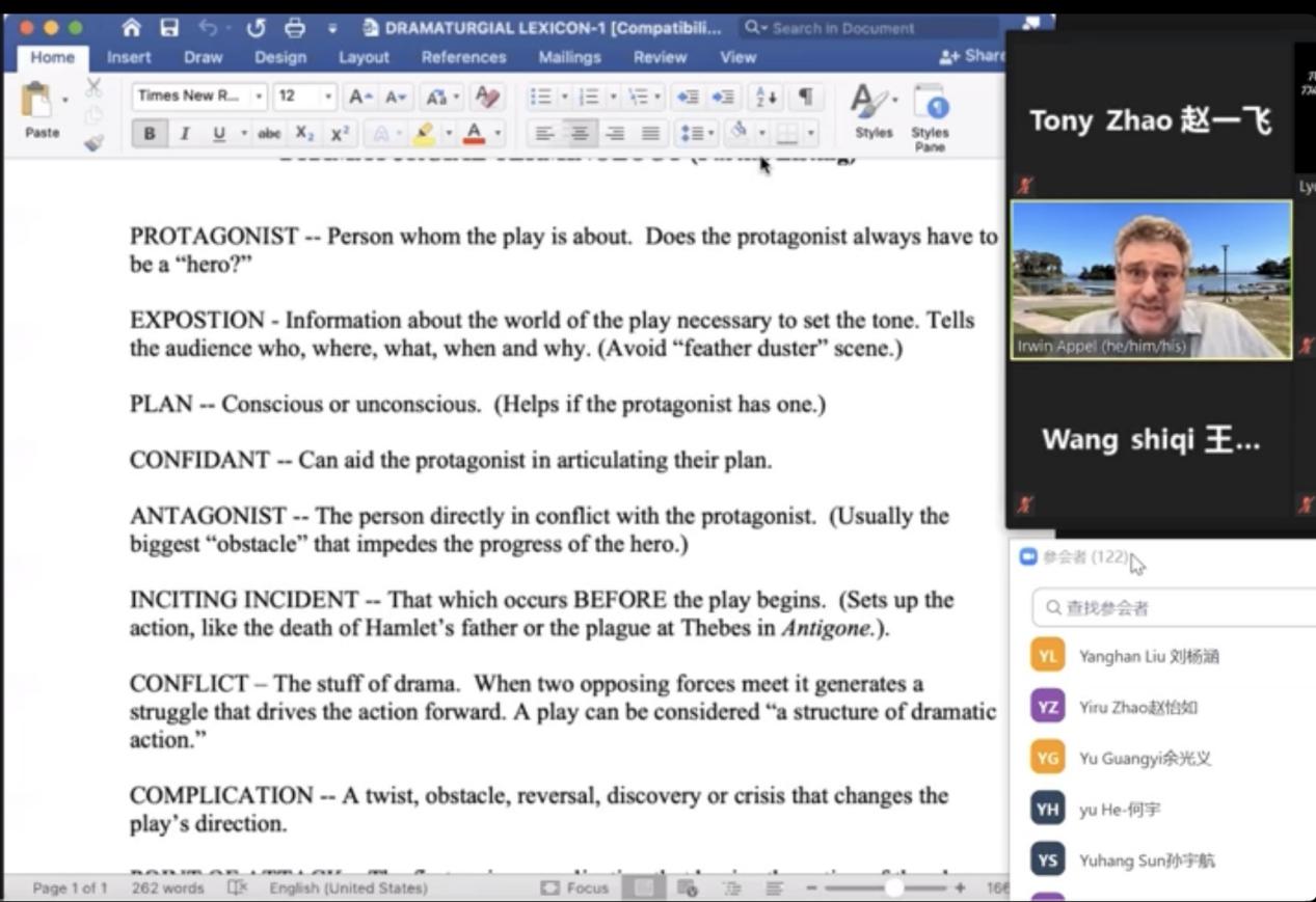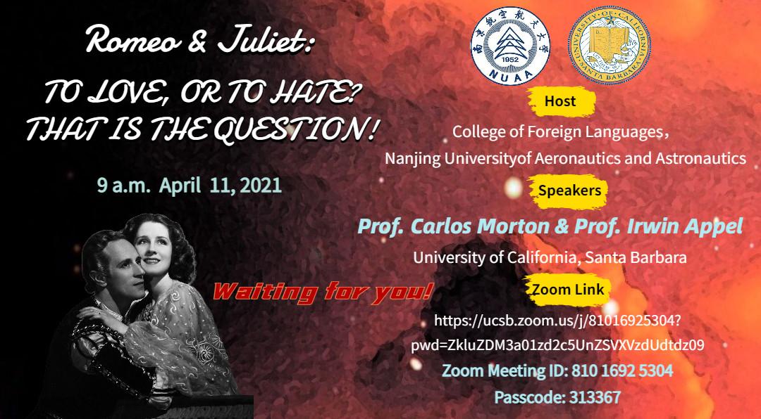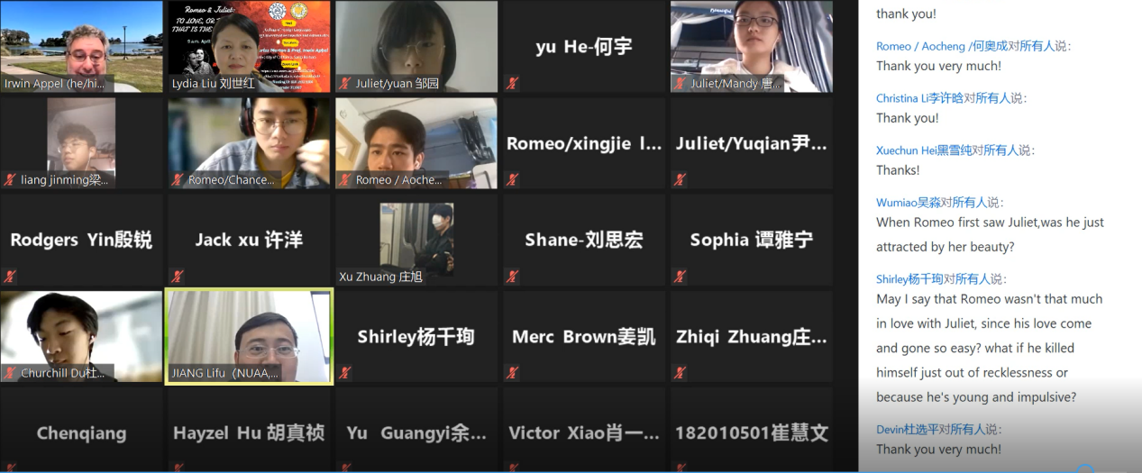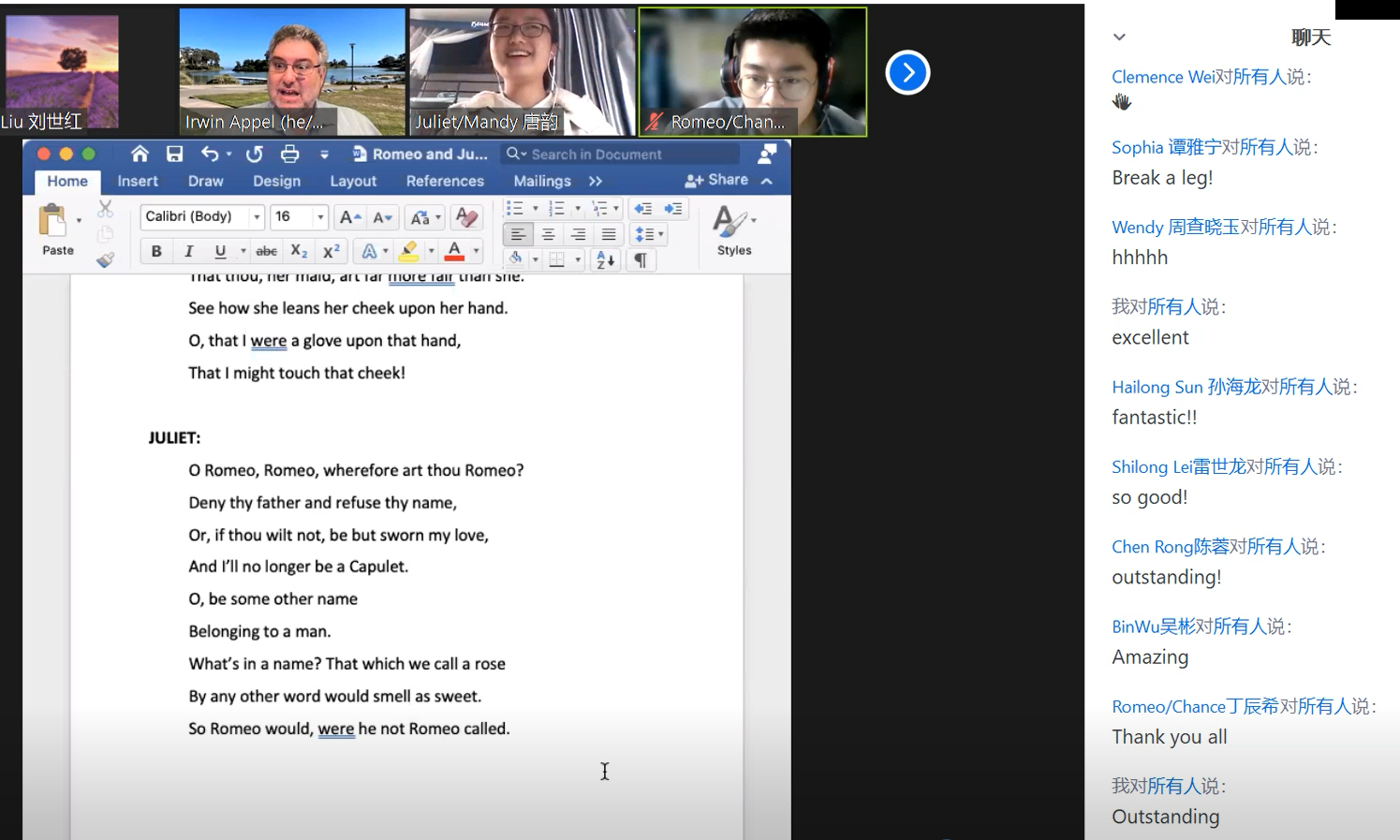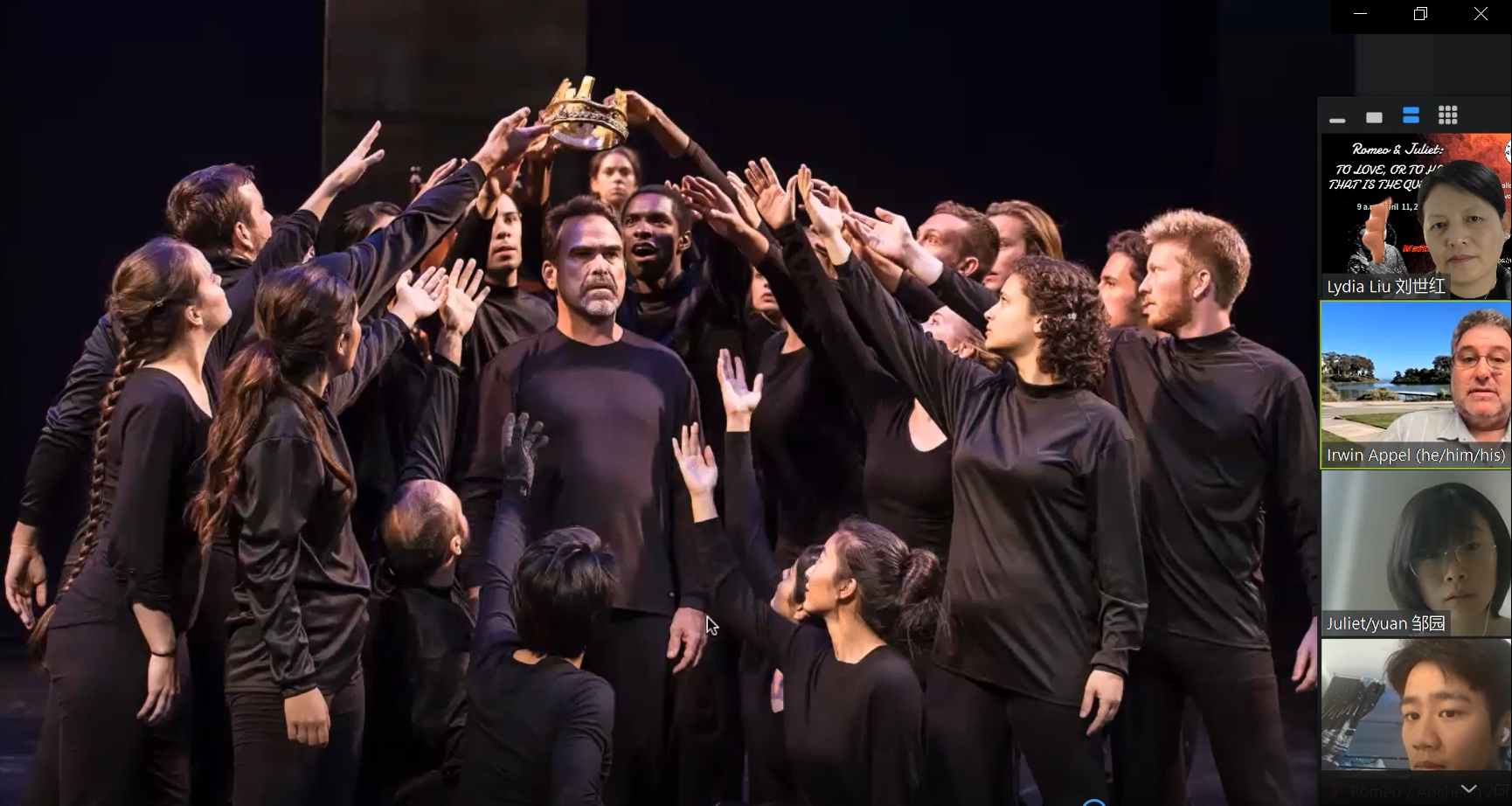 本次讲座共分为两个环节,由伟德bv国际体育国际联络中心主任、刘世红副教授主持。在第一环节中,加州大学圣巴巴拉分校戏剧教授Irwin Appel从自己的研究和实践情况出发,和同学们分享了人物角色、人物关系、故事背景、情节设置和台词意义等方面的相关知识。教授还结合《罗密欧与茱丽叶》中的情节介绍了戏剧中的各要素,如主角、情节、反面角色、事件、矛盾冲突、高潮等。随后,教授和同学们针对《罗密欧与茱丽叶》剧情相关的问题进行了热烈讨论,而Irwin Appel教授针对同学们的问题进行了一一解答,向同学们展示了自己的见解。在第二环节中,身为演员的Appel教授通过对比不同背景音乐、变换语气语调,亲自朗诵了《罗密欧与茱丽叶》中的经典台词和独白,并指导同学们对其中的精彩片段进行了演绎和表演。随后,Irwin Appel教授启发同学们围绕莎士比亚戏剧的表达思想以及《罗密欧与茱丽叶》的悲剧内核展开了热烈的讨论,与会的师生们通过会议软件聊天室、或者开麦提问,气氛活跃,互动精彩纷呈。讲座的最后,伟德官网副院长姜礼福老师对讲座进行了总结,高度评价了Irwin Appel教授讲座的学术价值,并邀请Irwin Appel教授未来到我校开展更多更深入的合作交流。