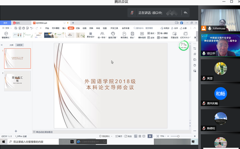 根据教务处统一部署,12月3日中午,伟德bv国际体育举办了2018级本科论文导师线上培训会议。英语系主任张立新教授主持会议,院长范祥涛教授、副院长徐以中教授、姜礼福副教授、学院督导组长谢小苑教授及教学办老师、英日语专业论文指导教师参加了会议。