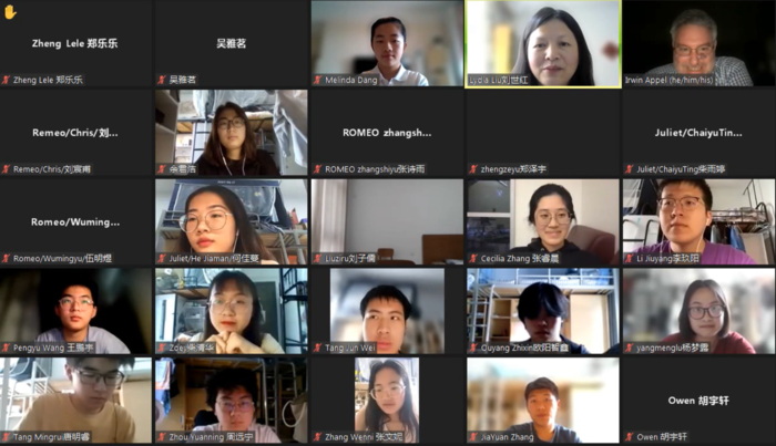本次讲座由伟德bv国际体育刘世红副教授主持。在讲座的上半场,Irwin Appel教授诠释了西方最伟大的戏剧家莎士比亚创作的思想内涵和艺术价值,展示丰富多彩的戏剧舞台演绎手法和理念,解读《罗密欧与朱丽叶》中爱情故事的深层意义。在讲座中精心穿插多种有趣的互动环节,引导观众领略莎翁戏剧的语言特色和艺术魅力。下半场的讲座中,多位学生演员表演《罗密欧与朱丽叶》经典对白,表演生动精彩,获得Irwin Appel教授及与观众的高度赞扬,Irwin Appel并给予悉心指导。在讲座最后的问答环节中,同学们纷纷在聊天室打字、以及开麦出镜提问, Irwin Appel教授一一答疑解惑,将讲座气氛引入高潮。