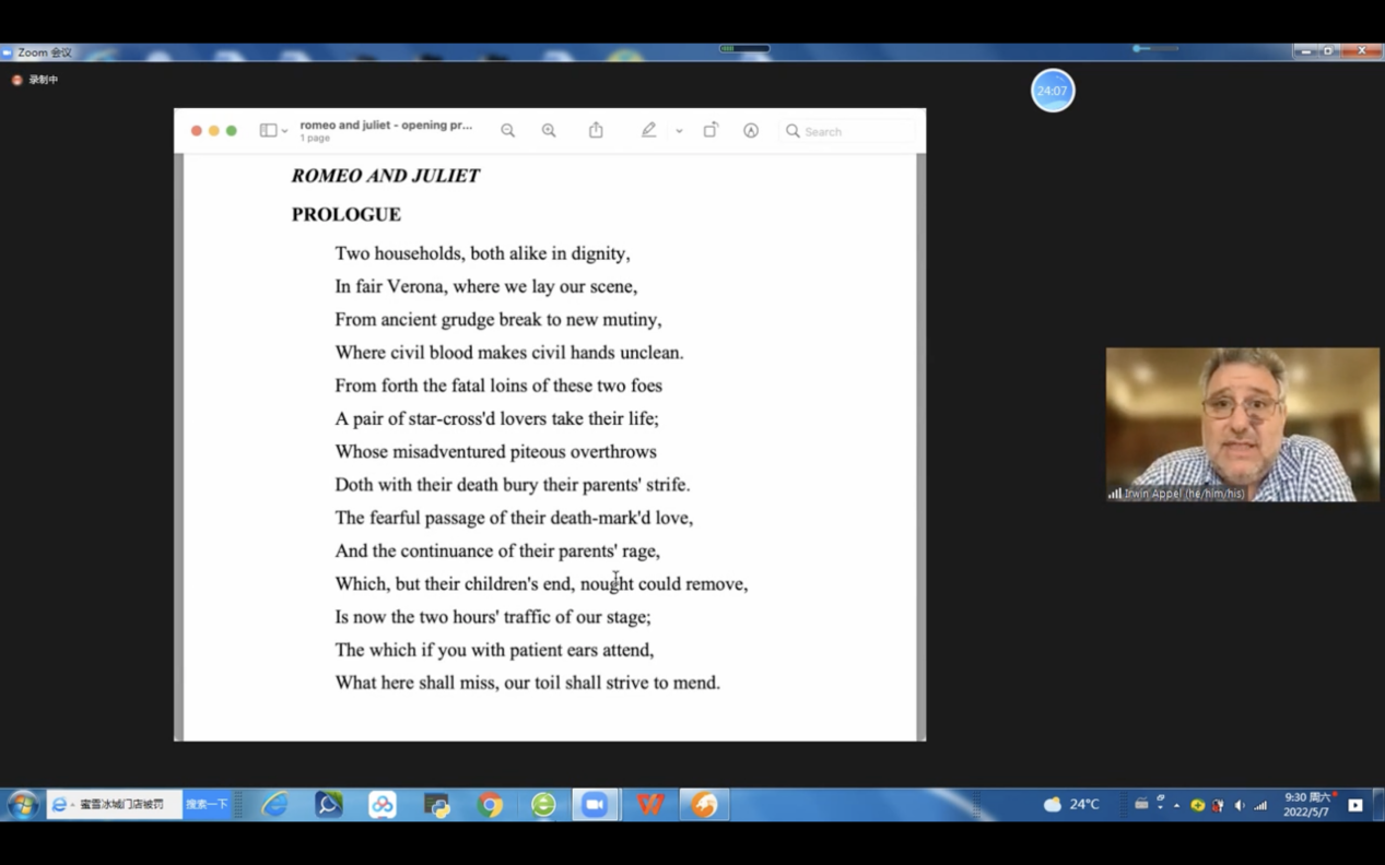 2022年5月7日上午,由伟德bv国际体育主办,邀请美国著名导演、加州大学圣芭芭拉分校戏剧与舞蹈系主任Irwin Appel教授为我校师生讲解莎翁戏剧,这是该教授在本学期第二次讲授戏剧专题。此次讲座的主题为“莎士比亚戏剧在南京:《罗密欧与朱丽叶》赏析”,为伟德bv国际体育举办的“海外名家讲坛”系列讲座之一。我校师生们对莎翁戏剧热情不减,积极参与,气氛热烈融洽,讲座获得圆满成功。