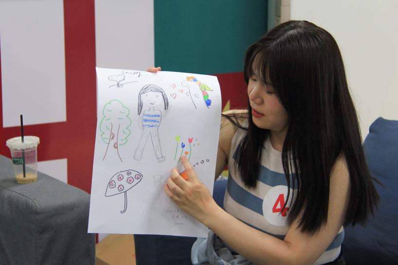第二个环节是“我的自画像”,也是本次活动的重头戏。同学们自行选取绘画工具,任意发挥想象在白纸上描绘出心中的自己。完成自画像之后,每位同学对自己的作品进行了阐述,在场的其他同学都给出了热烈的回应,袁辰馨也从心理学专业角度进行解读,帮助大家更好地认识自我。