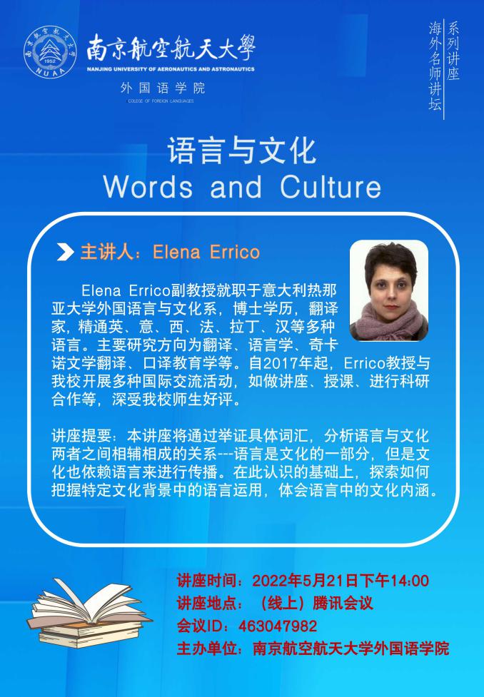 2022年5月21日下午,意大利热那亚大学的Elena Errico教授应邀为我校师生做了一场主题为《语言与文化》的学术讲座,这是本学期以来伟德bv国际体育举办的又一次“海外名家讲坛”系列讲座。Elena Errico教授在语言学和翻译学上的专业性以及其清晰精深的讲解获得了南航师生的一致好评。