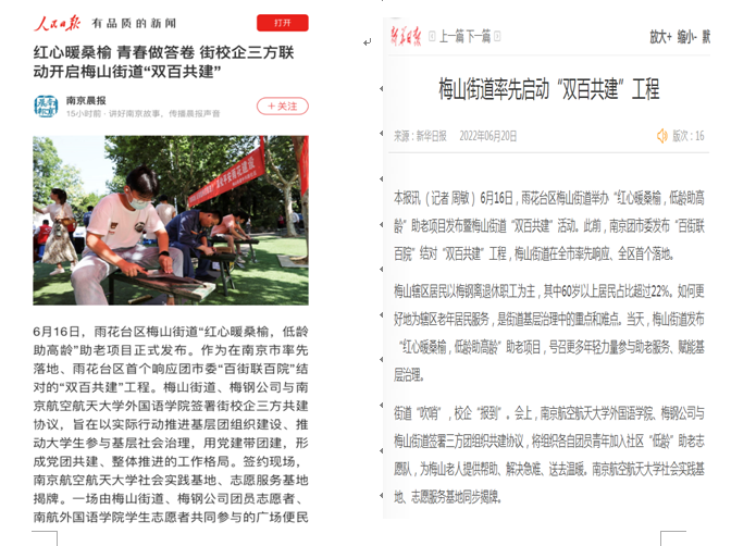 6月16日,伟德bv国际体育师生赴南京雨花区梅山街道开展“双百共建”活动,梅山街道党工委书记陈志新、办事处主任李文浩、党工委副书记杨镇宁,梅钢公司统战部部长苏潜、团委书记徐立立,伟德bv国际体育党委书记左彤云、校团委副书记赵铮、学院党委副书记梁薇参加了此次活动。活动得到了人民日报平台、新华日报、南京晨报的宣传报道。