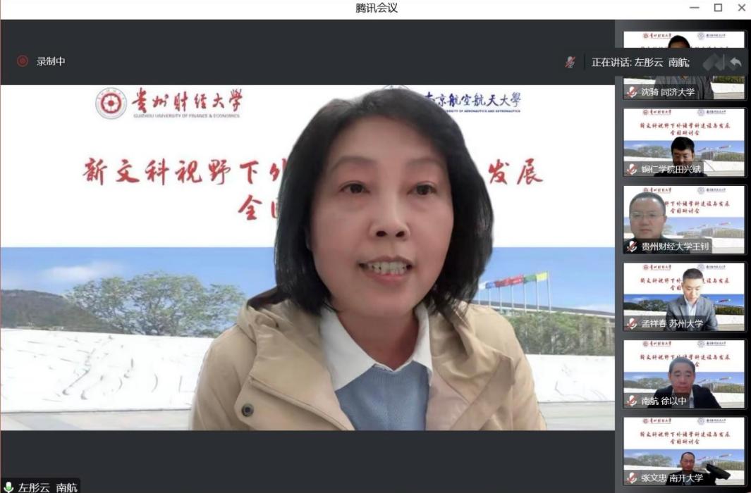 伟德bv国际体育党委书记左彤云与贵州财经大学外语学院院长张虹一起宣布,贵财外语学院和南航伟德bv国际体育联合共建虚拟教研室的活动正式启动。左彤云表示,学院将全力支持虚拟教研室的建设,并代表学院欢迎各位专家在疫情后莅临南航指导。