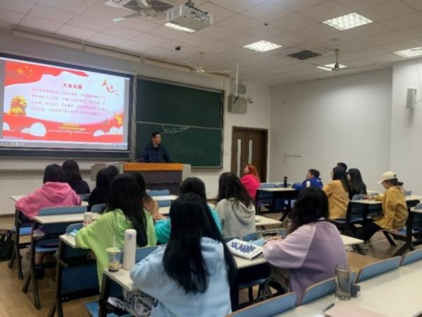 师生党员集体观看了中国共产党国际形象网宣片。之后,巫和雄讲授学习党的二十大报告专题党课。他分别就党的二十大报告中的十五个部分完整地为党员们梳理了其结构脉络,仔细讲解了每个方面的深层内涵和努力方向;并在与专业学习关系密切的教育、就业和文化等方面,展开了深入的探讨。他指出,作为翻译专业的学生,要响应国家号召,帮助中国文化走出去,服务于国家文化软实力建设以及我国对外话语的建构。他还结合自己在中东维和的工作经历以及参观古田会议旧址的经历,呼吁各位党员要以更严格的标准要求自己,发挥党员的先锋模范作用,不断取得更大的进步。最后,巫和雄带领大家重温了习近平总书记的殷切期待 “时代呼唤着我们,人民期待着我们,唯有矢志不渝、笃行不怠、方能不负时代,不负人民”。