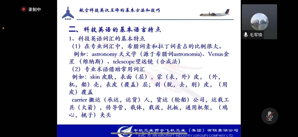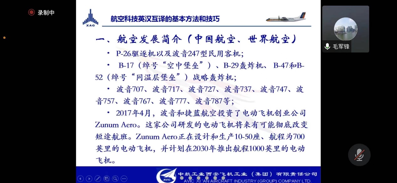 2023年3月3日晚,南航伟德bv国际体育MTI教育中心邀请了知名企业导师毛军锋译审给2022级研究生带来行业翻译实训的第一堂课。毛军锋现任中国航空工业集团有限责任公司翻译系列高级专业技术职务任职资格评审委员会委员、中国翻译协会专家会员、中国航空学会会员。本次课程,毛老师给大家带来了航空科技英汉互译的基本方法和技巧系列课程,侧重分析和探讨了航空科技汉译英的翻译策略。