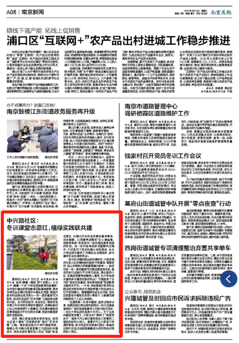 近日,《南京晨报》报道了伟德bv国际体育联合雨花台区梅山街道中兴路社区开展“传承红色基因,争当绿色使者”劳动教育主题冬训活动。本次活动利用一年一度的植树节开展志愿服务,有效推动党建带团建深入基层,为大学生党员、团员提供参与基层实践的机会。学院团委书记李萍、本科生联合党支部书记彭欢、学生党员代表团员代表及中兴路社区党员代表参与了本次活动。