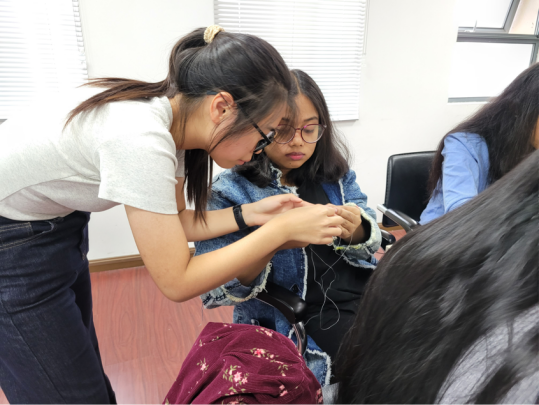 串一曲欢乐颂,串一个同心圆。活动前期,由手工坊里的小老师们耐心地指导大家串珠方法。从刚开始的生疏和笨拙,到后来的娴熟和自如,大家有说有笑,或热心帮忙,或认真观摩,一派欢乐忙碌的景象。一颗颗流光溢彩的珠子正如我们每个独特的个体,渐渐团结组合在一起,闪耀出更加璀璨的光芒。
