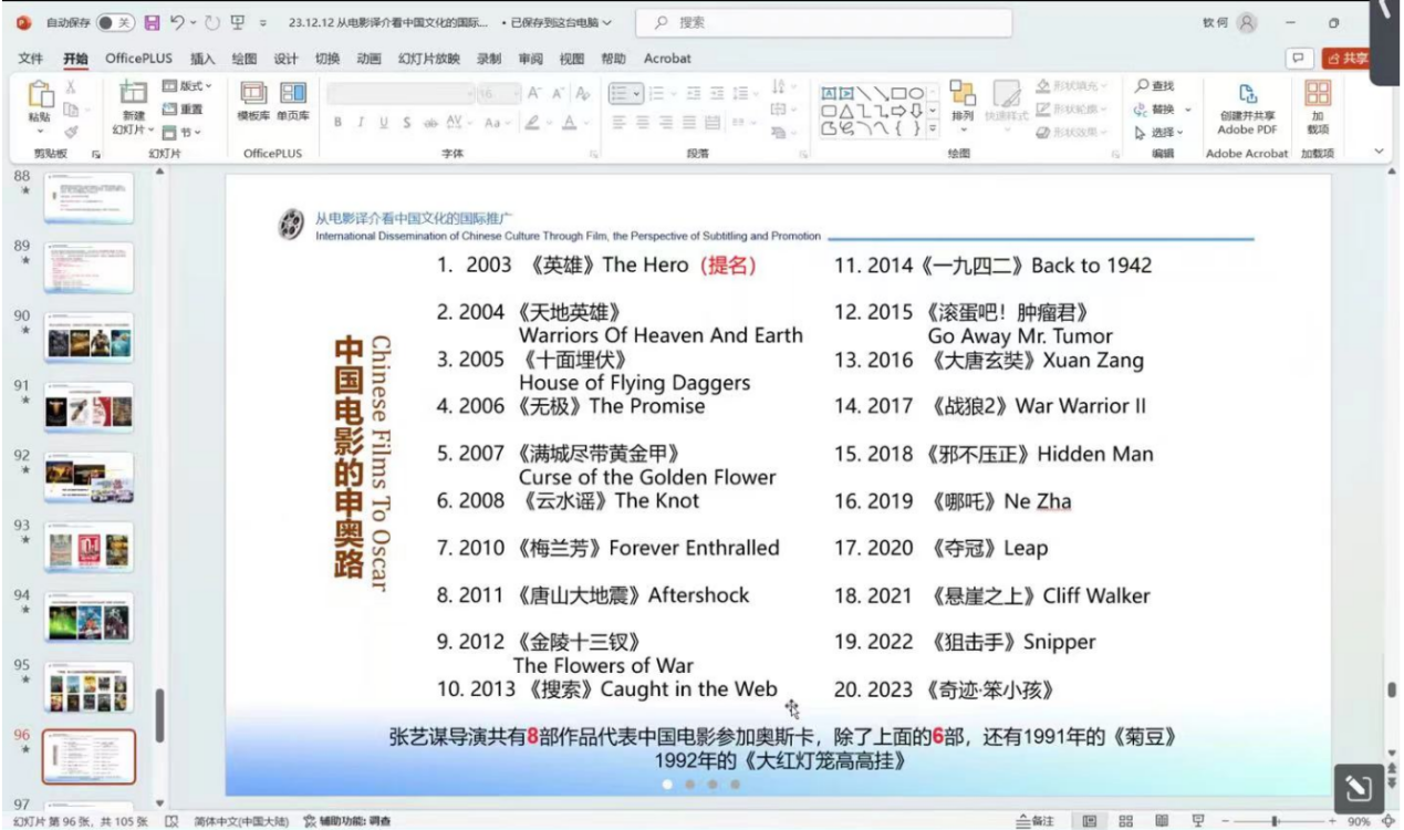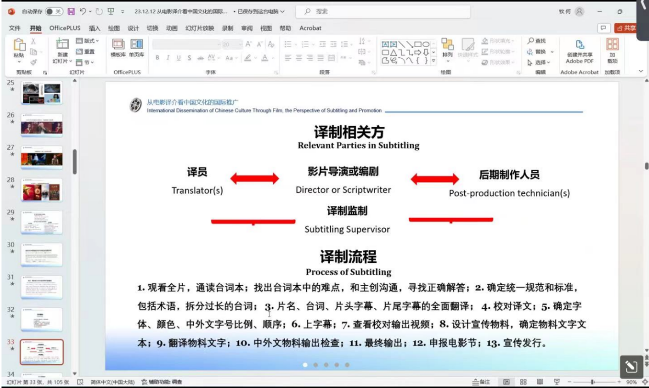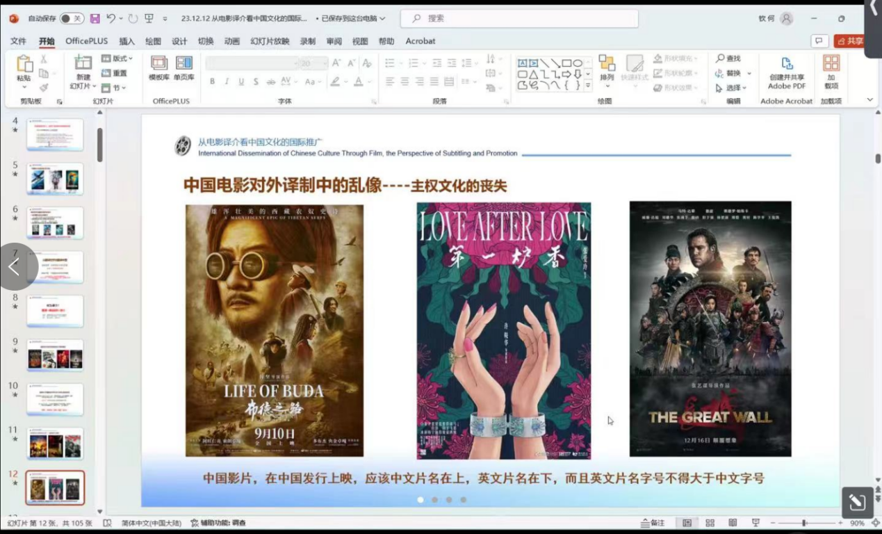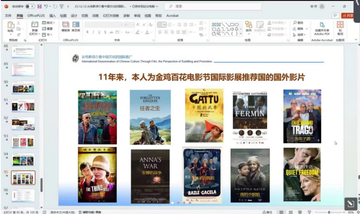随后,何钦结合了自己参与的多部国际电影节入围作品,如《情比山高》等,用实际案例为同学们详细梳理了从翻译在影片开发、创作、宣传和发行中每个环节的应用,深入分析中国电影对外译介中所面临的挑战。他认为,一部优秀的作品,要想成功申报国际电影节,除了电影本身优秀外,更需要了解各大电影节的规则和特点,并充分做好宣传物料的准备和译制工作。