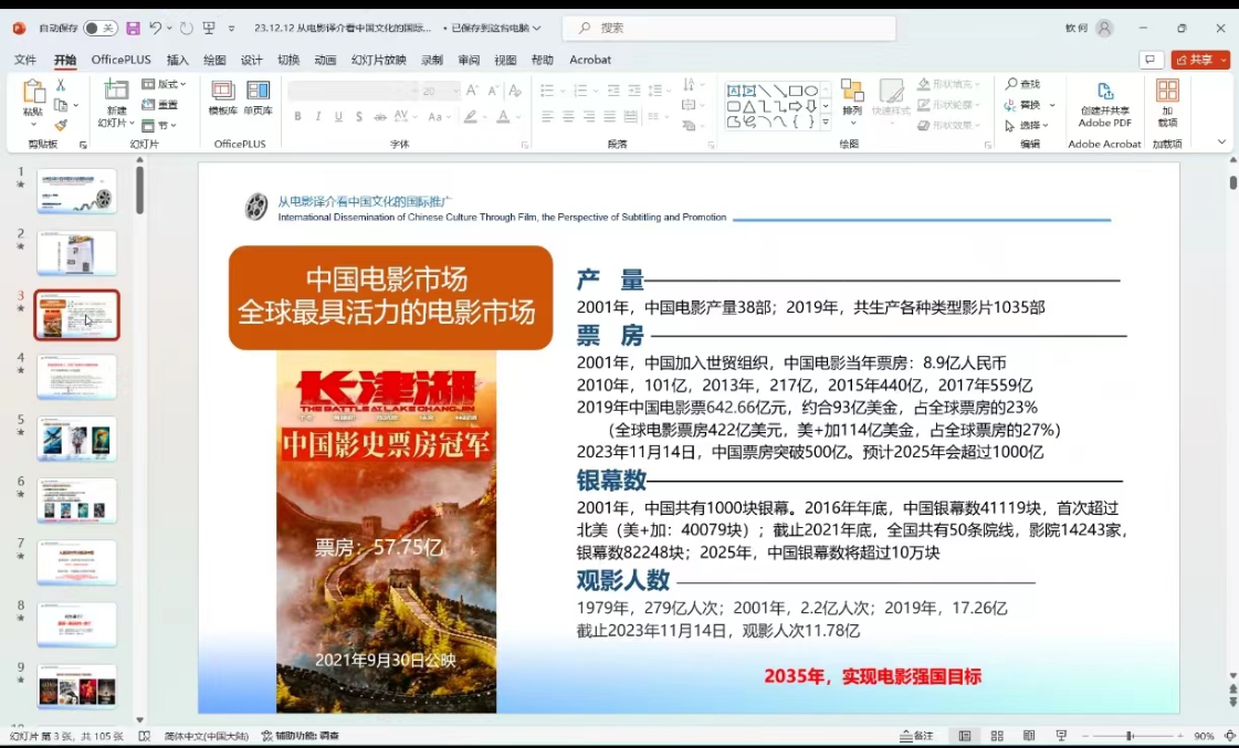 讲座伊始,何钦首先介绍了中国电影市场当前在世界电影市场的地位和影响力。通过详尽的数据,他指出,近几年来,中国电影业迅猛发展,不仅市场规模迅速扩大,而且电影制作水平也在不断提高,中国电影市场已经成为全球最具活力的电影市场,然而中国电影在国际市场上占有率仍然偏低,在国际上的影响力不够。何钦认为其中一个重要的原因就在于中国电影的对外译介做的不够好,对此,他详细介绍了国产影片对外译介及研究现状,深刻分析了其背后的原因,并发表了自己的见解。