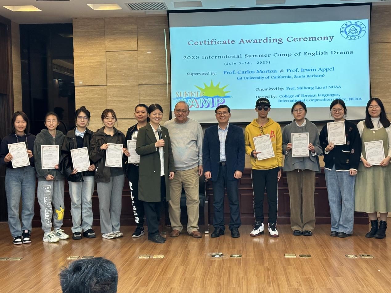 表演正式开始之前,进行了学校暑期国际课程“2023年度英语戏剧国际夏令营结营证书”发放仪式,该国际夏令营课程为伟德bv国际体育策划的特色国际课程、也是院团委组织的大学生暑期社会实践活动,目前已经连续举办四期,由加州大学的两位教授卡洛斯·莫顿和欧文·爱普(Irwin Appel)联袂执教,成为暑期课程中的热门课程。伟德bv国际体育副院长姜礼福教授和卡洛斯·莫顿教授亲自为学生们颁发了结营证书。