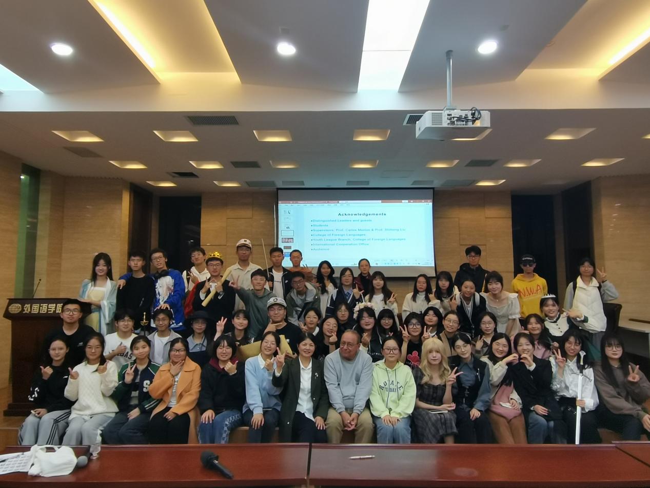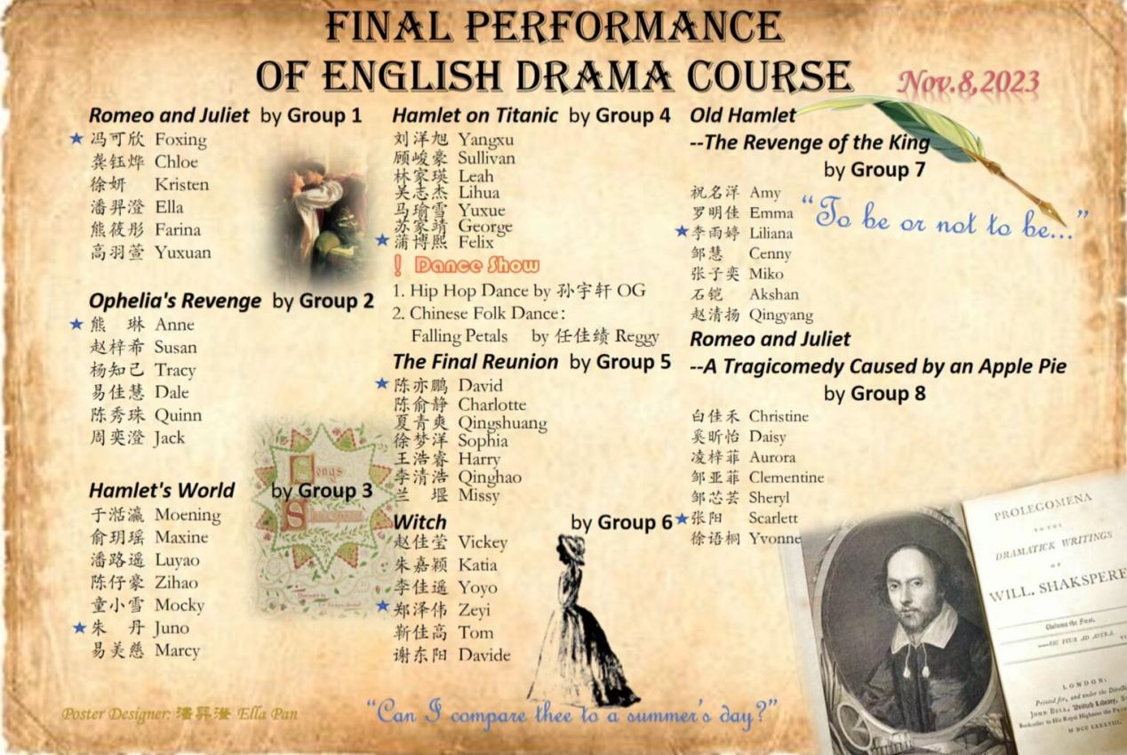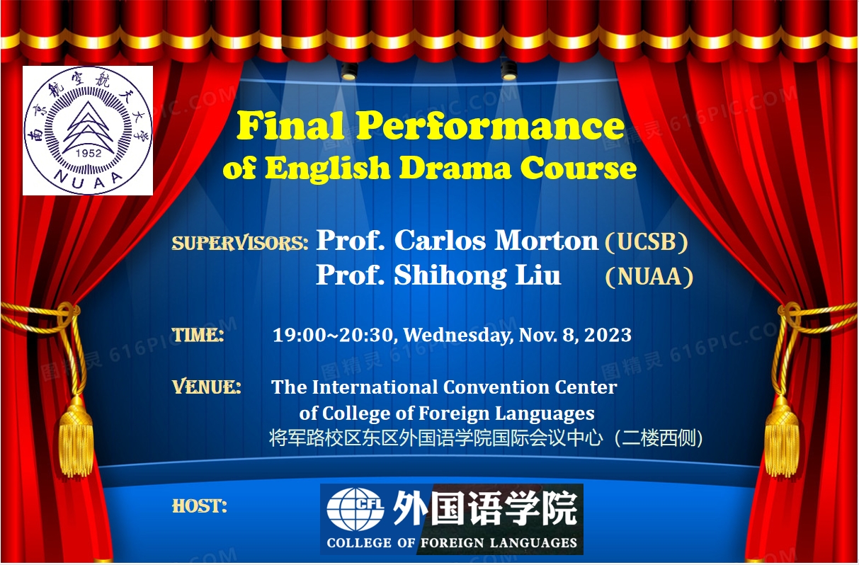 2023年11月8日晚,伟德bv国际体育在国际会议中心成功举办了校通识课《英语戏剧》课程汇报演出。该课程由美国著名戏剧家、加州大学卡洛斯·莫顿(Carlos Morton)教授和伟德bv国际体育副教授刘世红联合授课。通过该课程,学生系统学习了戏剧的发展史和理论知识,重点分析研究了英国最伟大的戏剧家莎士比亚的四部经典戏剧、并进行模仿和改编,最后将自己的改编作品搬上舞台。