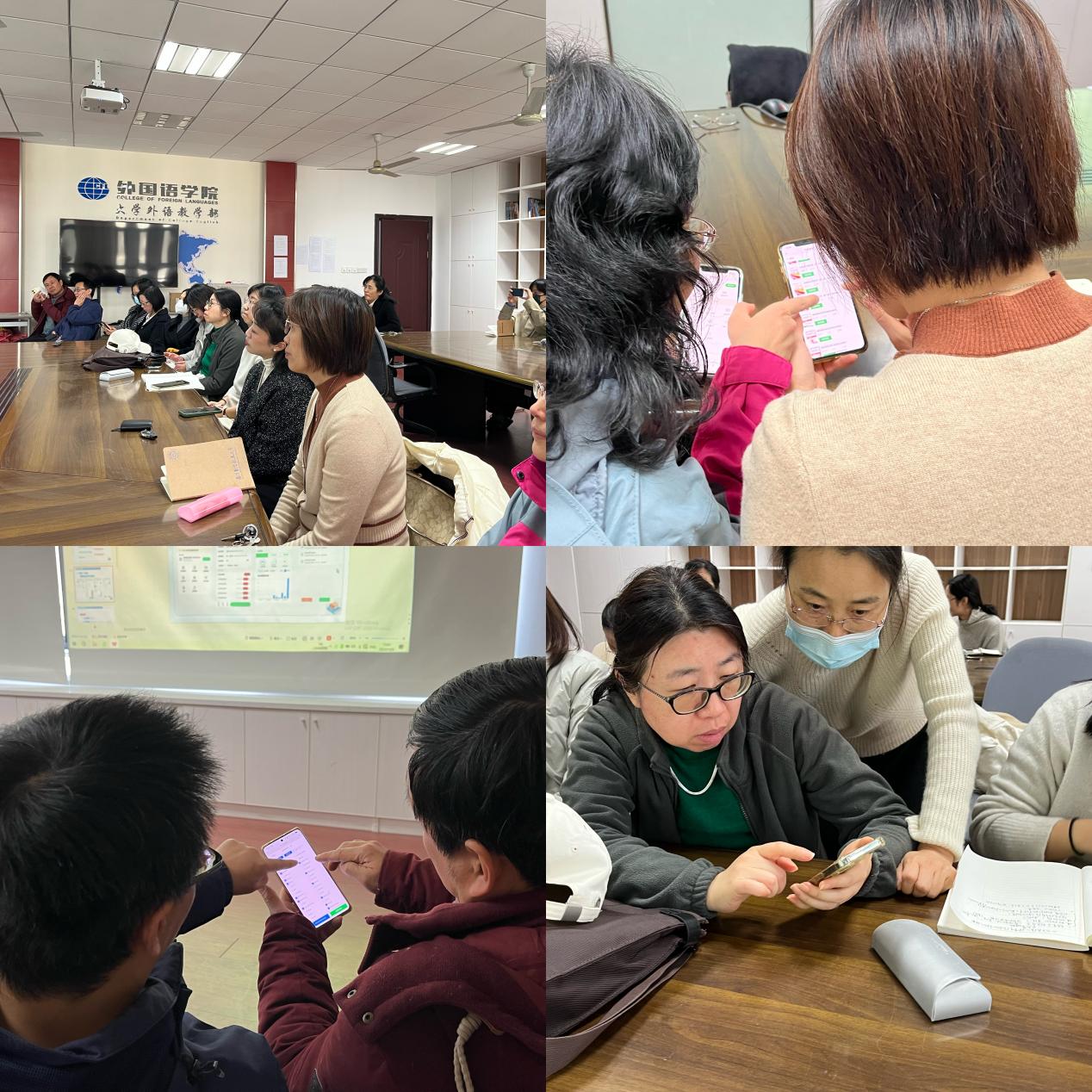 各位老师认真倾听、记录,在分享结束后纷纷拿出自己的手机,相互指导,练习“词达人”的测试功能。