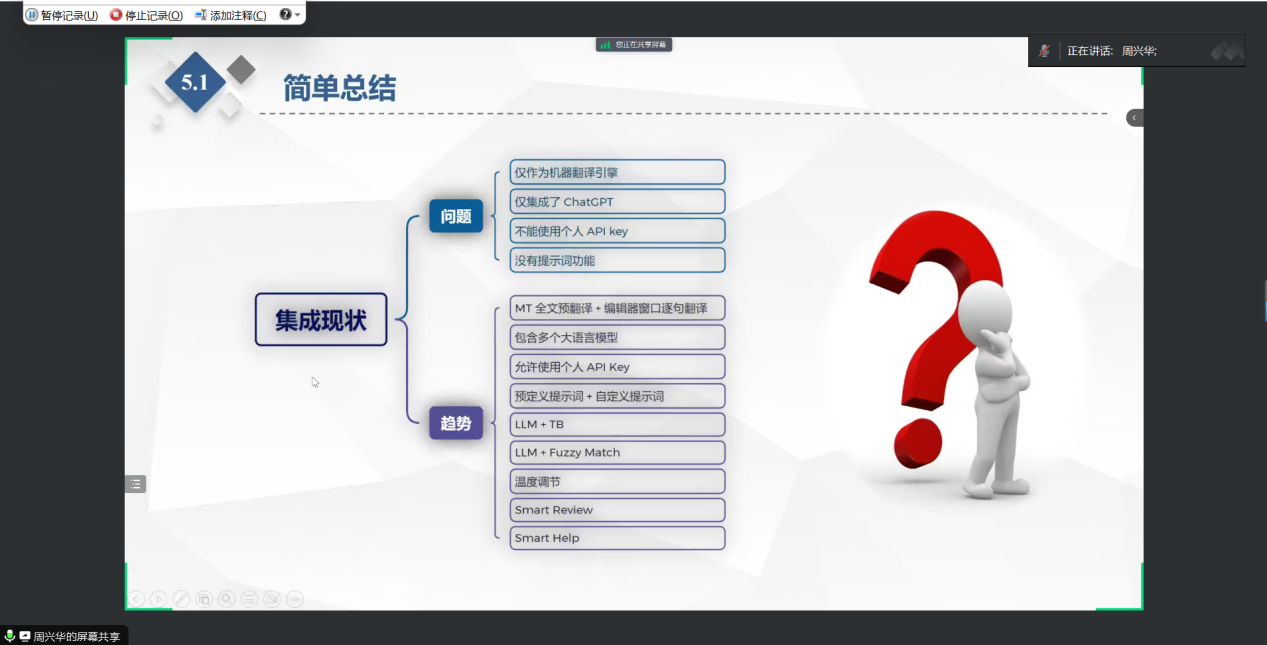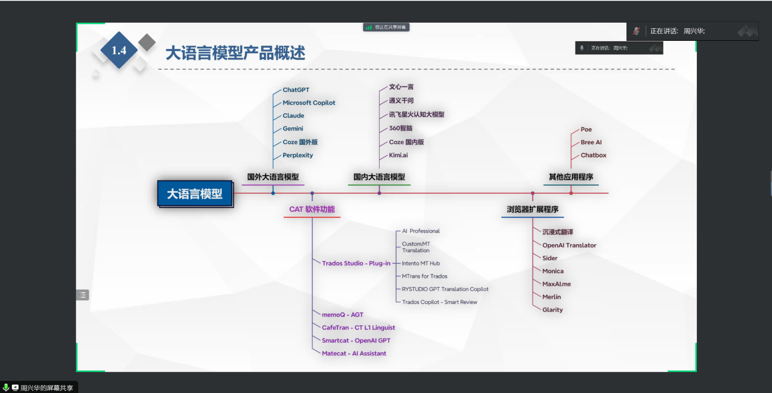 如今,人工智能的时代大势引发了深刻的技术革命、教育变革和数据革命,同时翻译技术也成为了翻译教学和实践中不可分割的部分,进一步推动了语言服务行业和高校教育的创新变革,促进了技术与人的和谐共生。为提升语言服务行业各方对翻译技术的认识和应用能力,加强语言服务人才的技术素养,加速语言技术成果的高效转化,2024年4月1日晚,南航伟德bv国际体育MTI教育中心邀请了翻译技术专家周兴华老师给2023级研究生带来了极具前沿特色的一堂翻译技术课。本次课程,周老师给大家带来了大语言模型与CAT软件的集成及实践应用系列课程,侧重分析和探讨了其应用优势与应用场景。