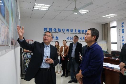 杭育新书记一行首先参观了伟德bv国际体育神经认知语言学实验室,数智化航空外语主题创新区及“耘天坊”国际文化传播发展研究大学生主题创新区,听取了相关负责人的介绍,详细了解实验室及主题创新区在学科研究、人才培养、校企合作等方面的教育教学工作和成果。