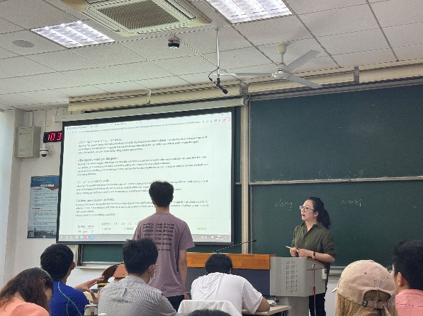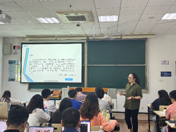 王老师的课堂教学给我留下了深刻的印象。她的教学风格自由活跃,注重培养学生的思辨能力,在作业讲解中了解学生的学习情况,在课堂上与学生多次进行亲切互动,引导学生针对不同观点畅所欲言,发表看法,让学生在轻松愉快的氛围中学习知识。