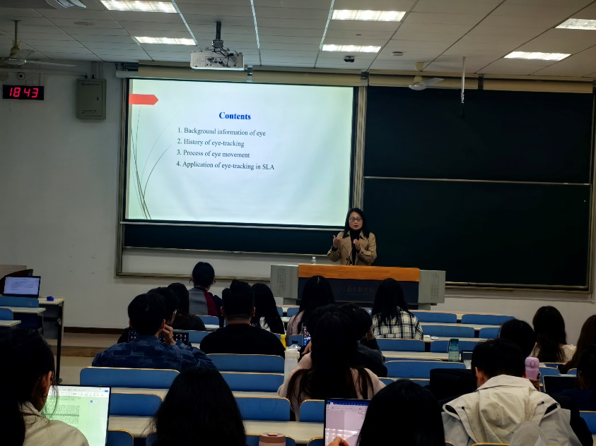 讲座内容主要包括眼球的内部结构、眼动仪的发展、眼动的原理、眼动指标的提取、眼动技术如何应用于语言加工过程等。刘博士结合自己的论文为同学们展示了眼动技术在视听双通道上的应用。讲座结束后,同学们及在场老师与刘博士展开了热烈地讨论,都表示受益匪浅。