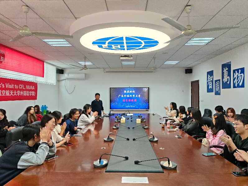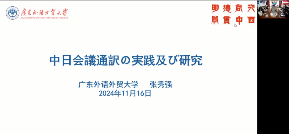 首先,为增强学生对口译行业前沿的了解,提升学习兴趣,学院邀请了广东外语外贸大学日语语言文化学院博士生导师张秀强教授,为同学们带来了一场题为“中日会議通訳の実践及び研究(中日会议口译实践及研究)”的讲座。张教授在讲座中讲解了口译的要领,并分享了口译技巧、译员的素质与能力、训练方法及口译相关研究动向。