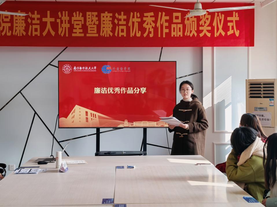 随后是廉洁文化作品分享环节。在本次廉洁文化作品征集活动中,同学们以多种多样的形式展现了廉洁文化的深刻内涵。获奖学生代表分享了自己的创作故事和灵感来源。他们有的将历史典故与现代生活巧妙融合,绘制了寓意深远的廉洁漫画,让大家在细腻的笔触中领悟到清正廉洁的重要性;有的深入挖掘廉洁人物的先进事迹,以征文的形式展现廉洁典范的高尚品质,激发起同学们对廉洁文化的共鸣与思考;有的则以新颖独特的短视频形式,用镜头语言讲述廉洁正能量,既接地气又引人深思。
