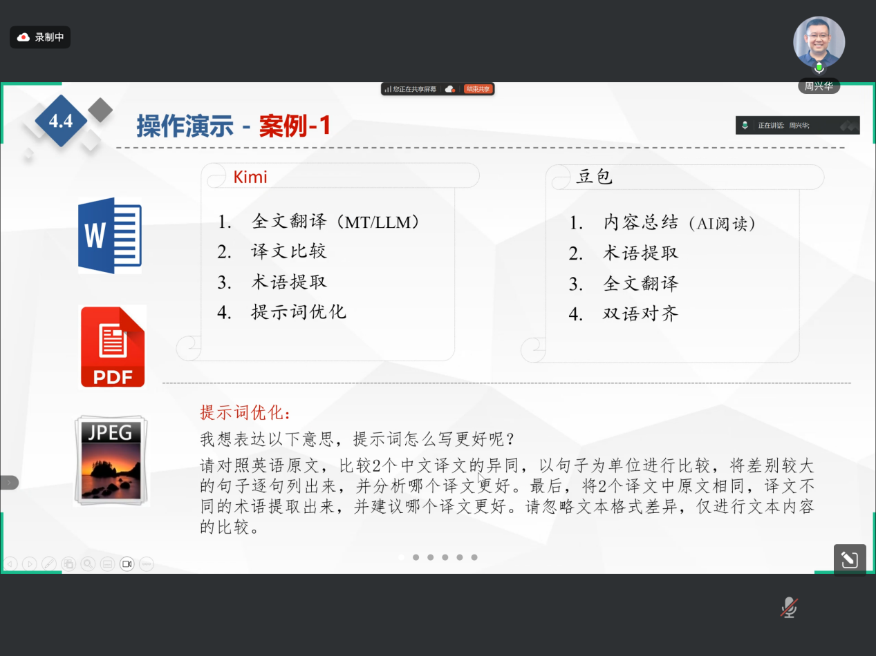 在讲座中,周兴华系统探讨了大语言模型(LLM)与计算机辅助翻译(CAT)技术在翻译实践中的应用,内容共分为CAT软件简介、大语言模型简介、LLM与CAT软件的集成、LLM工具与翻译实践应用四个部分。周兴华分享了CAT软件的发展历程和主要功能,阐述了大语言模型的概念、特点及其在翻译领域的应用前景。此外,周兴华通过实际操作Kimi和豆包等软件,演示多个案例,指导同学们如何利用软件的力量翻译、分析并整理文本等。